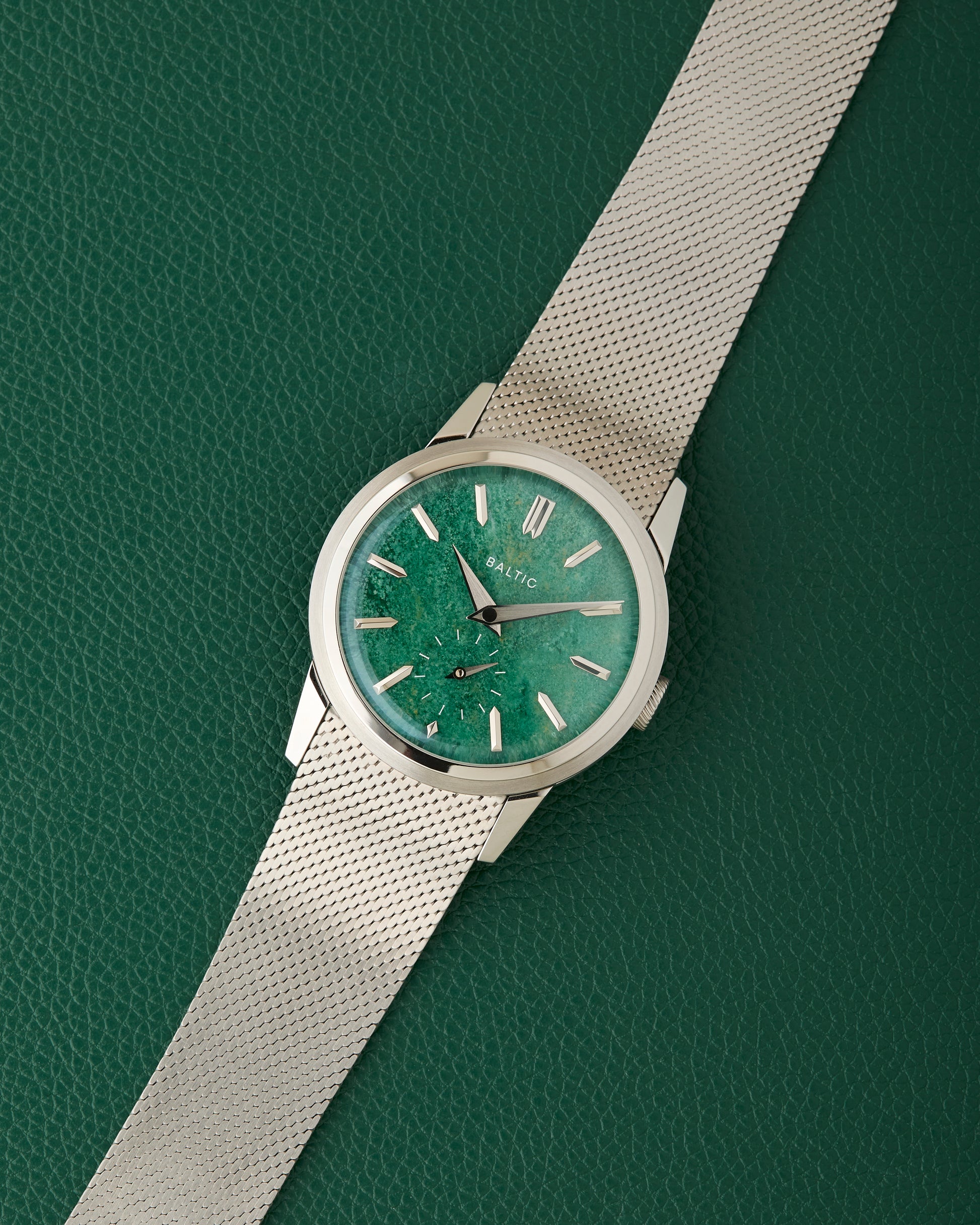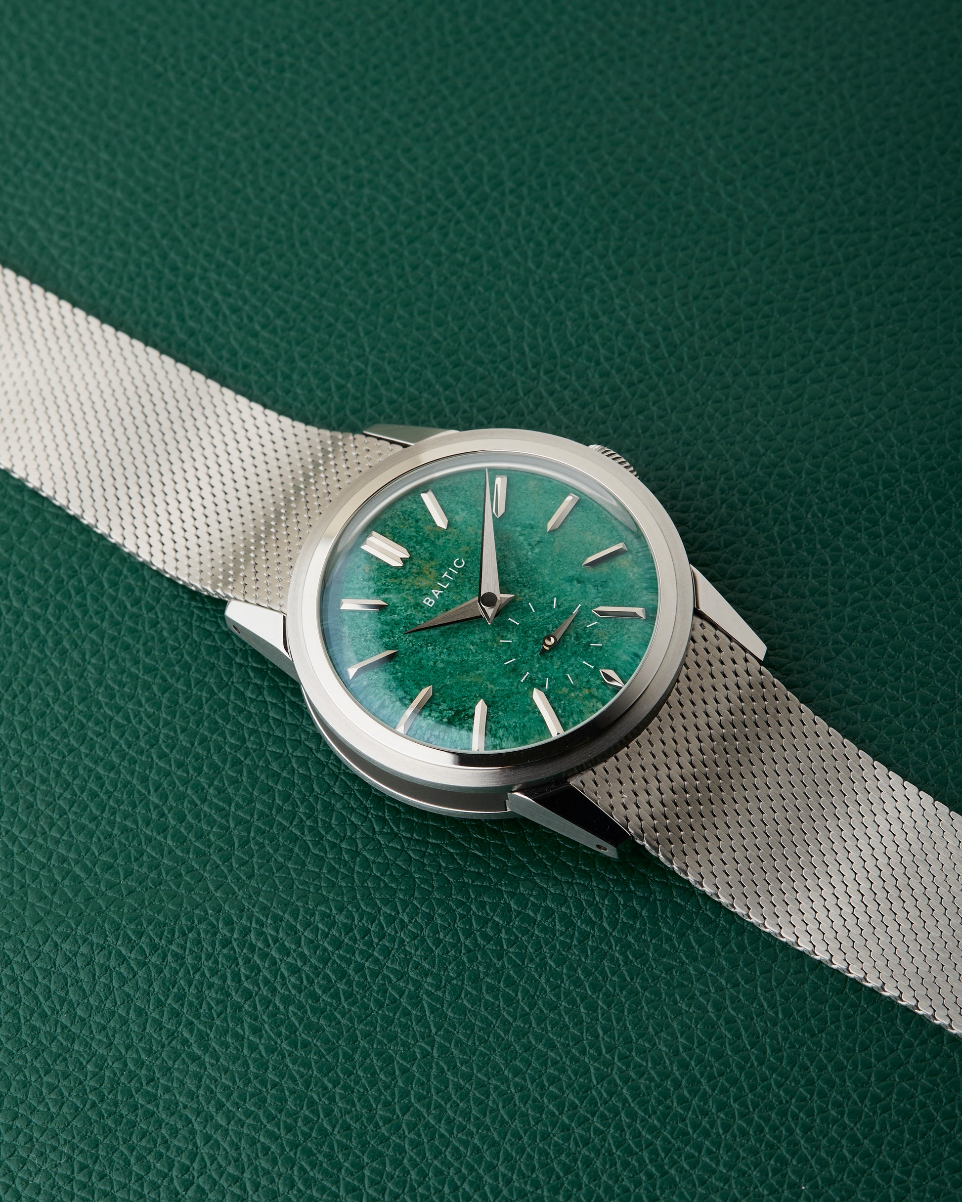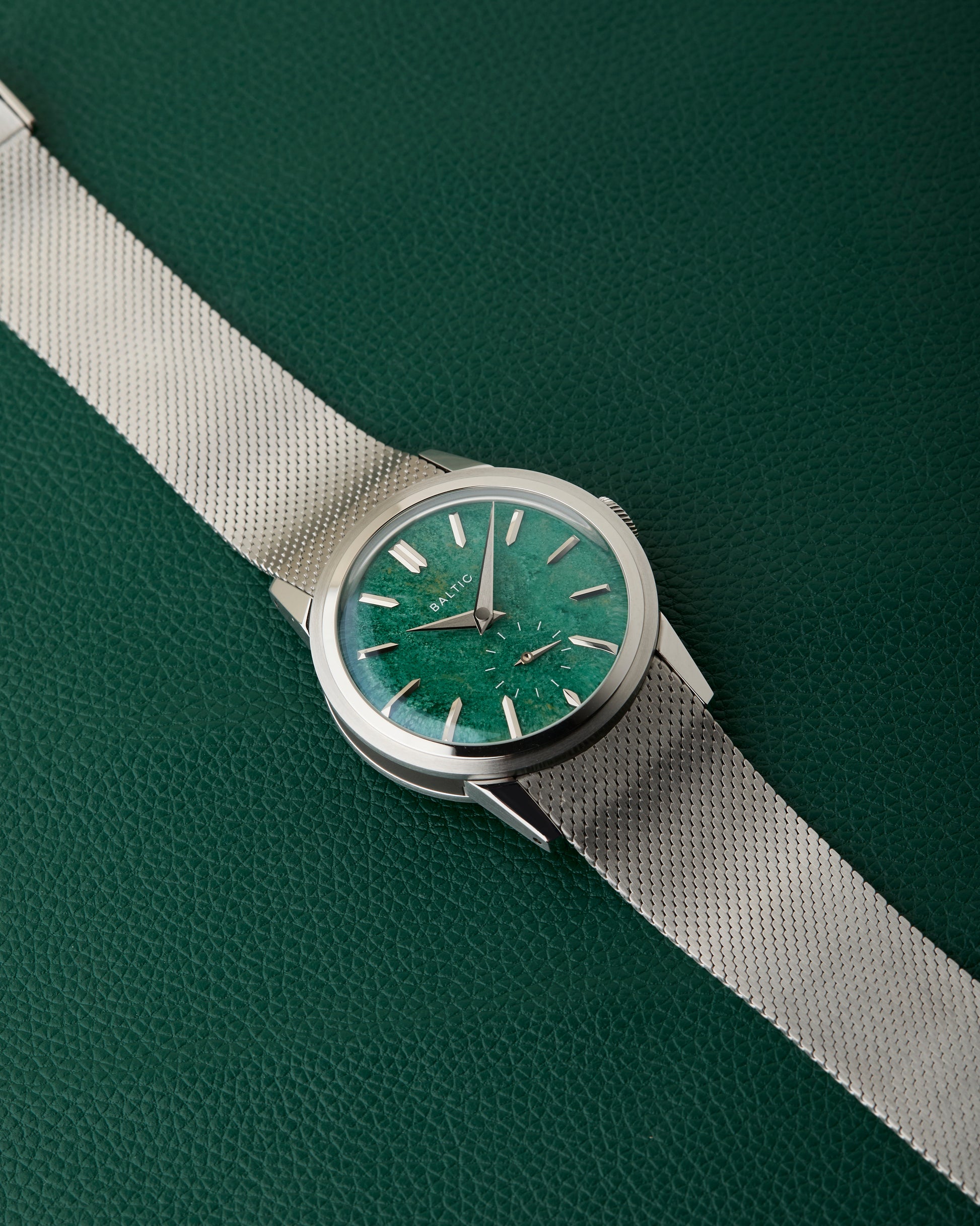 Comes fitted on its Baltic stainless steel mesh bracelet with signed clasp. We also have an additional Baltic leather strap with Baltic buckle.