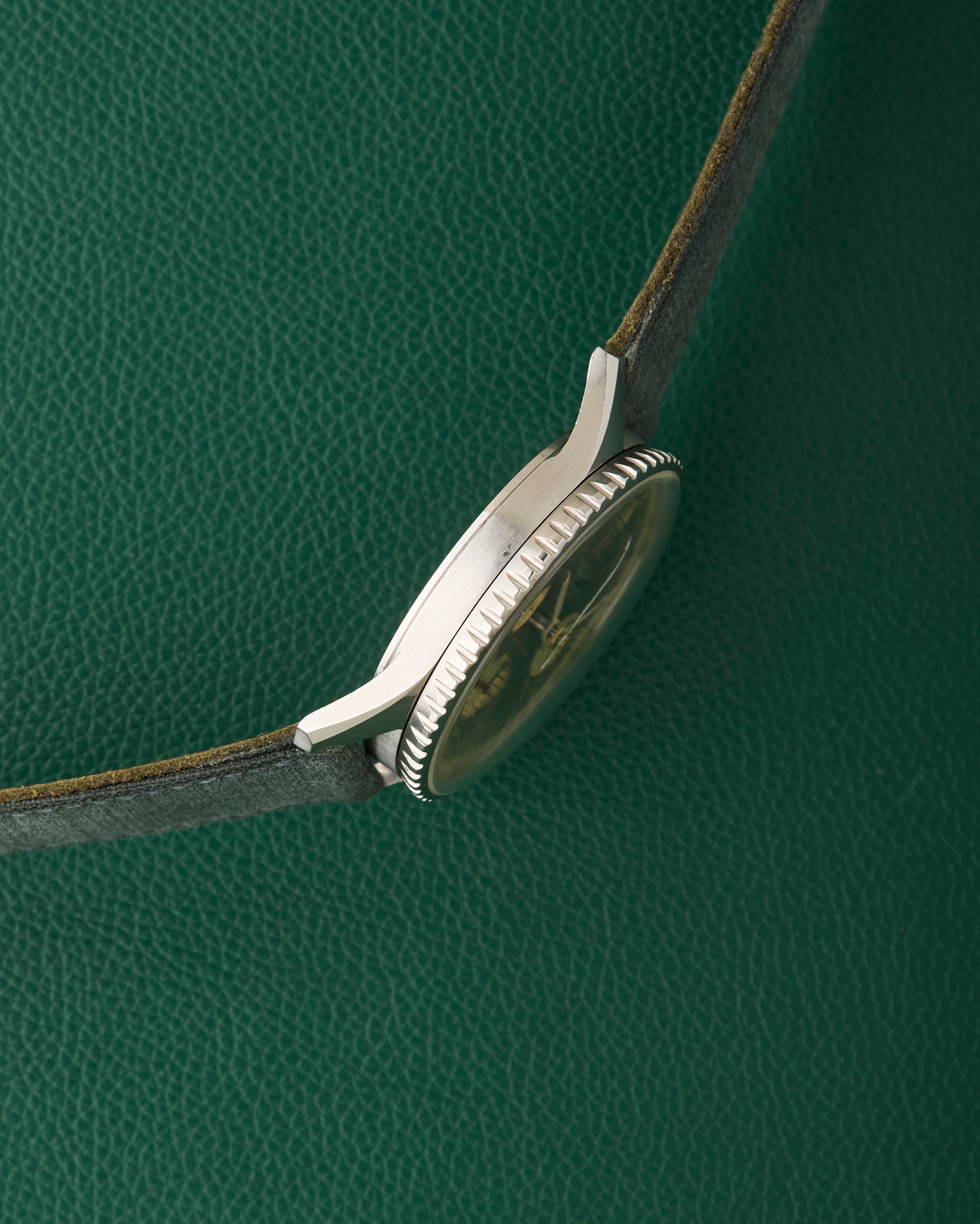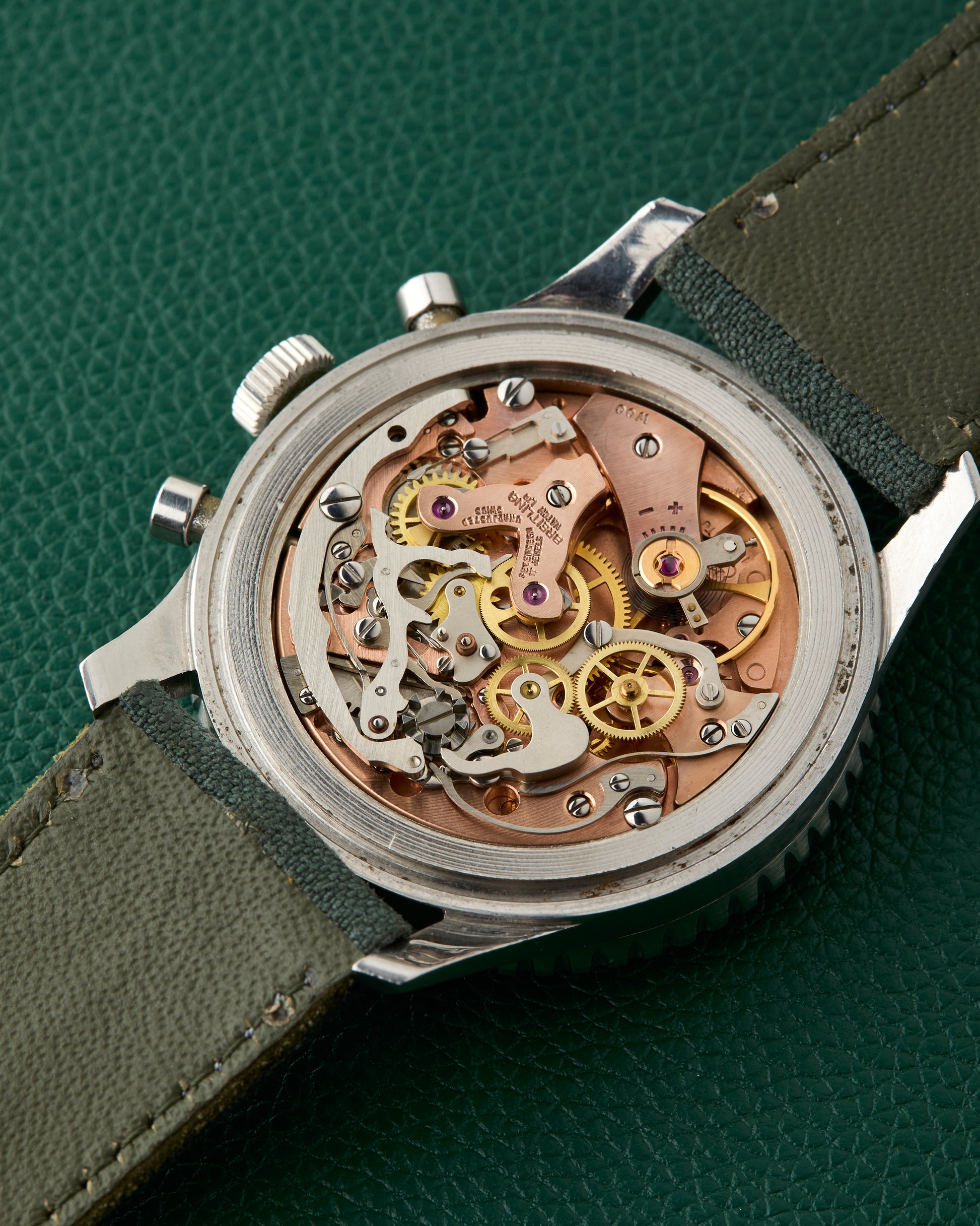 Inside beats the Venus calibre 178 manually wound chronograph movement.