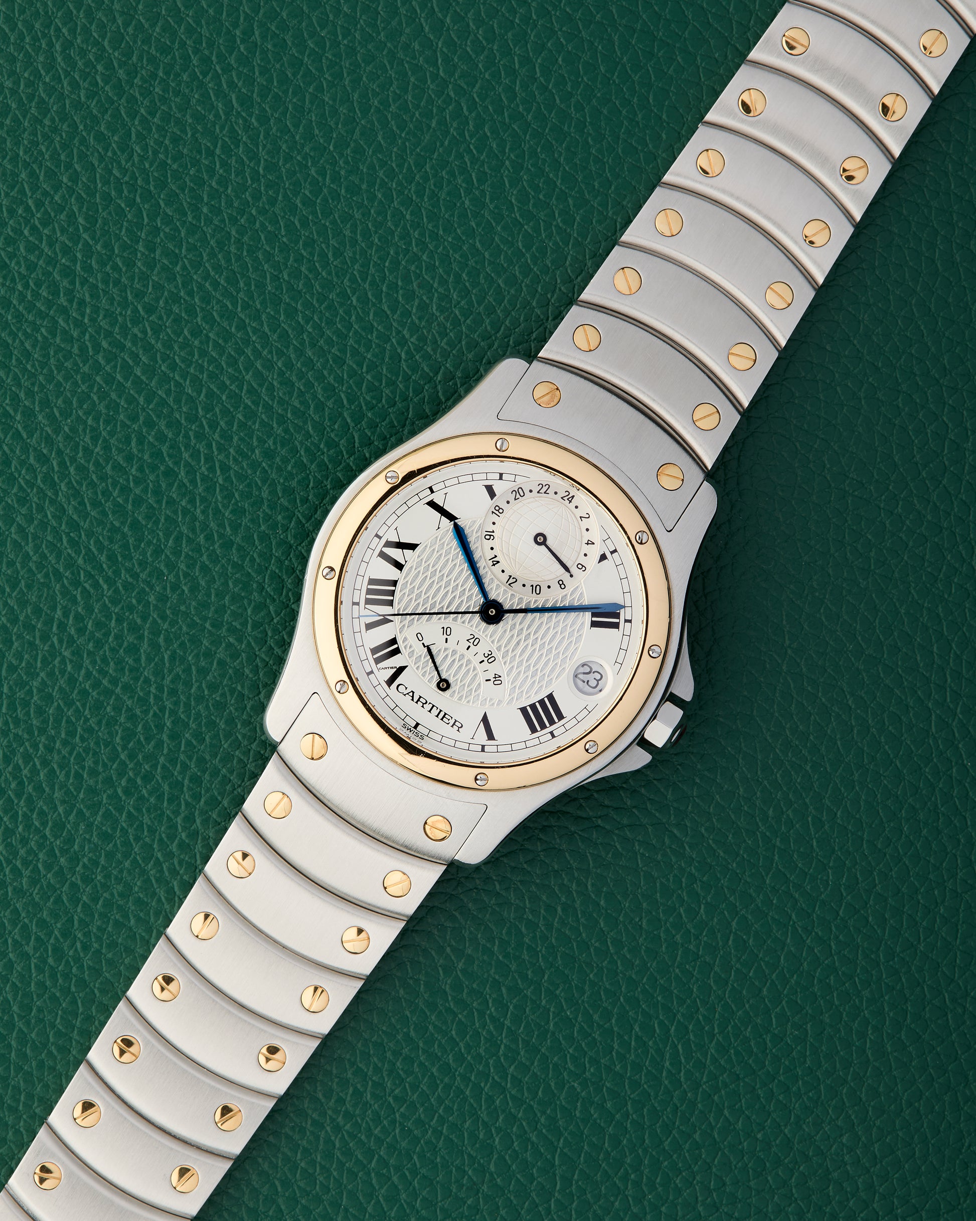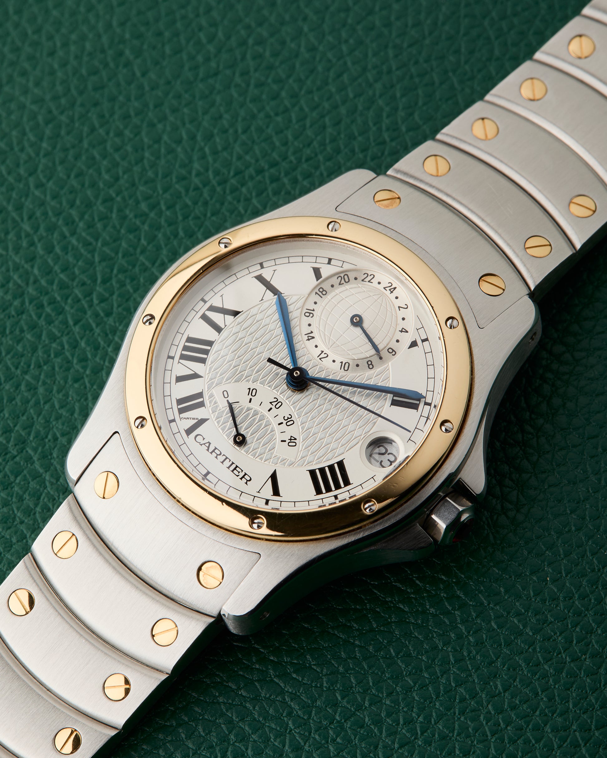 Our present Cartier Santos Ronde with reference W20038R3 features dual‑time GMT functionality, a power‑reserve indicator, and a guilloché silver dial with Roman numerals.