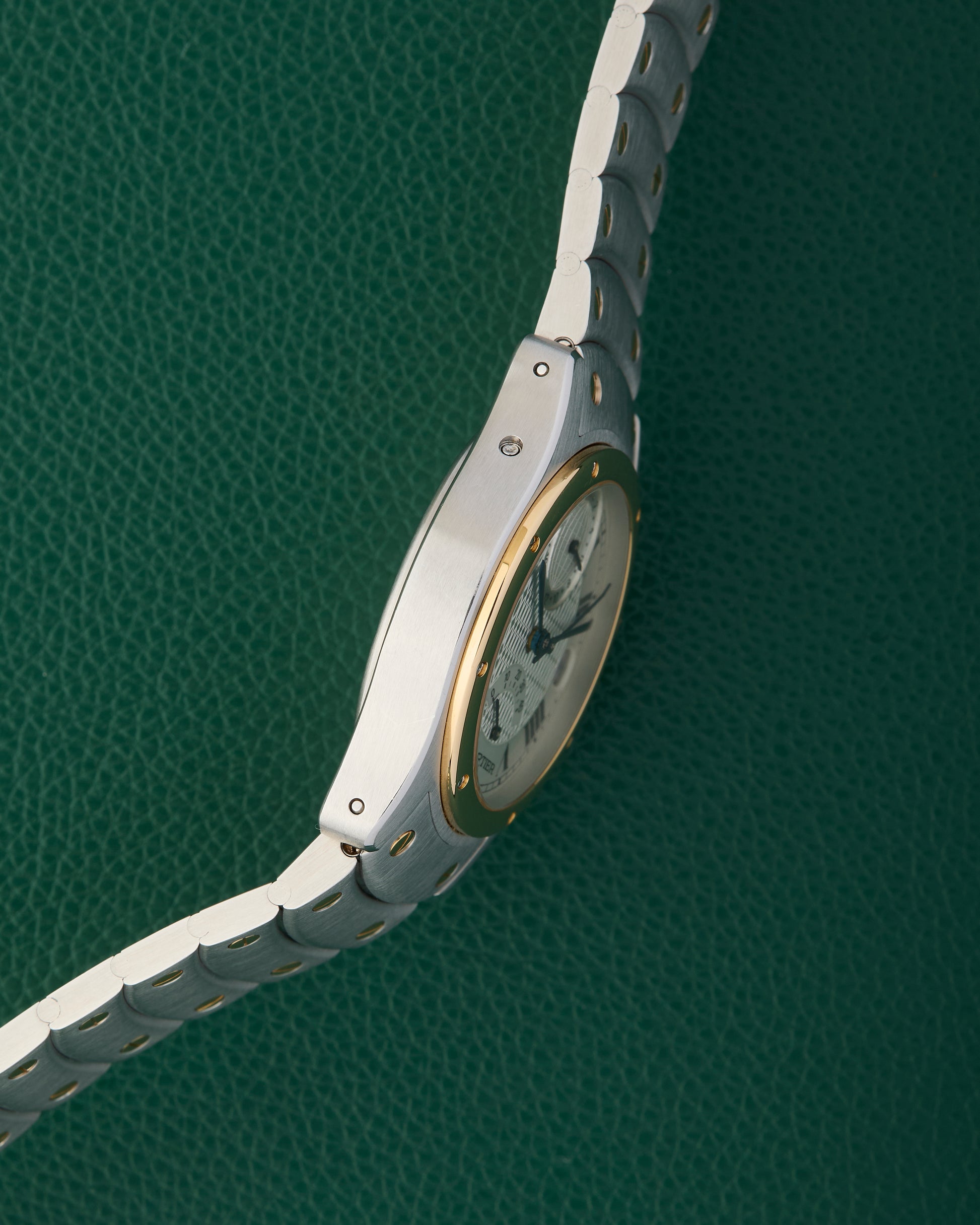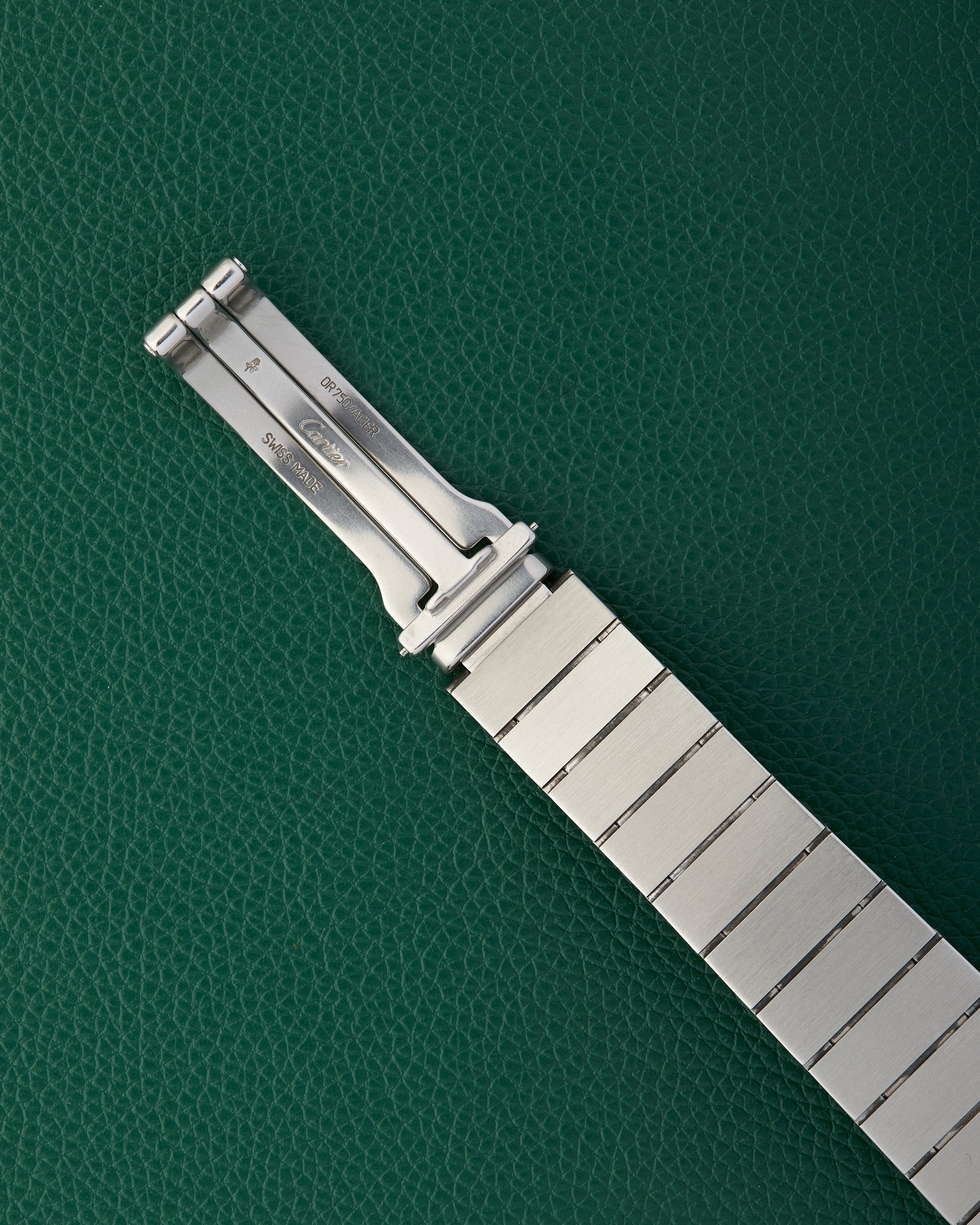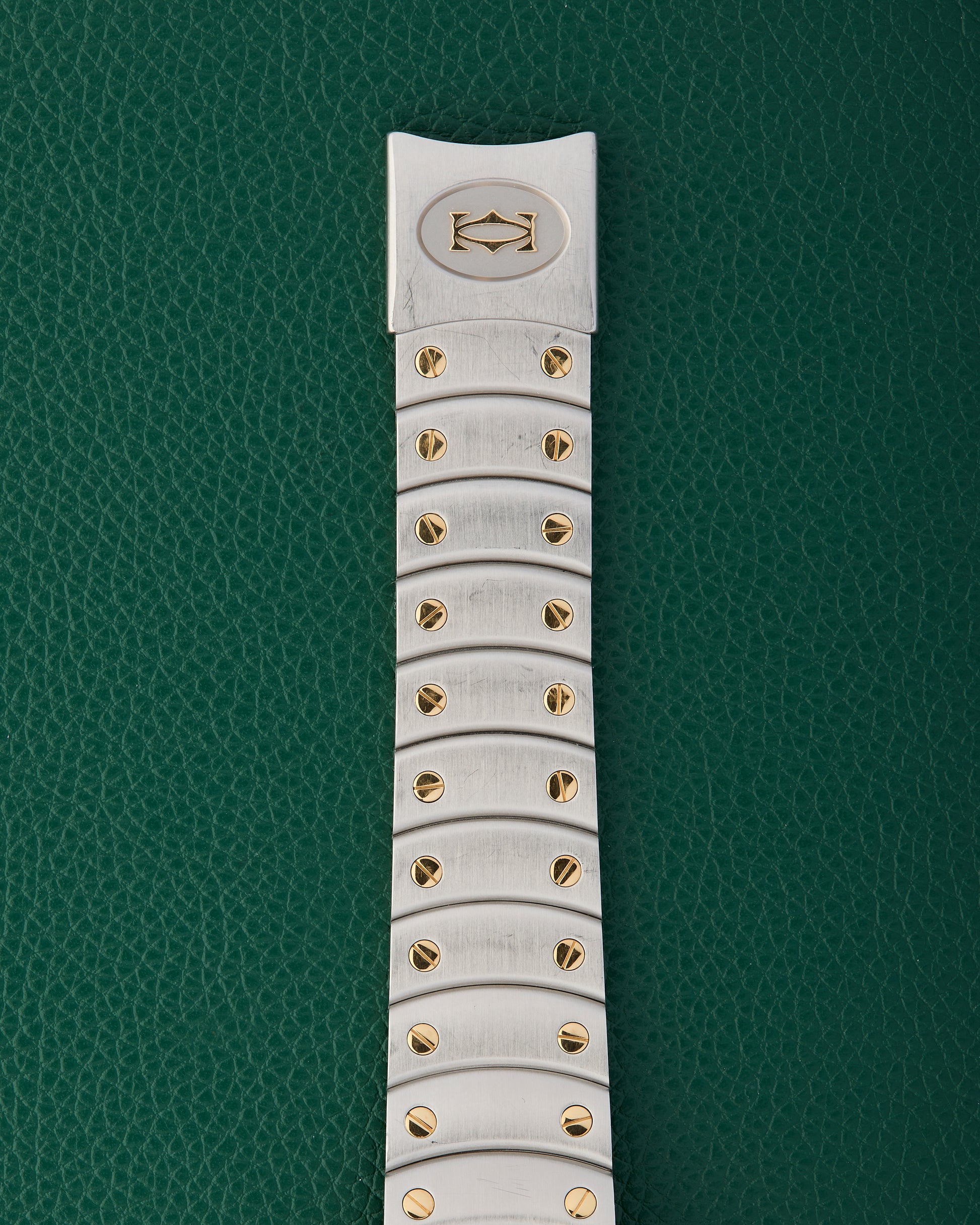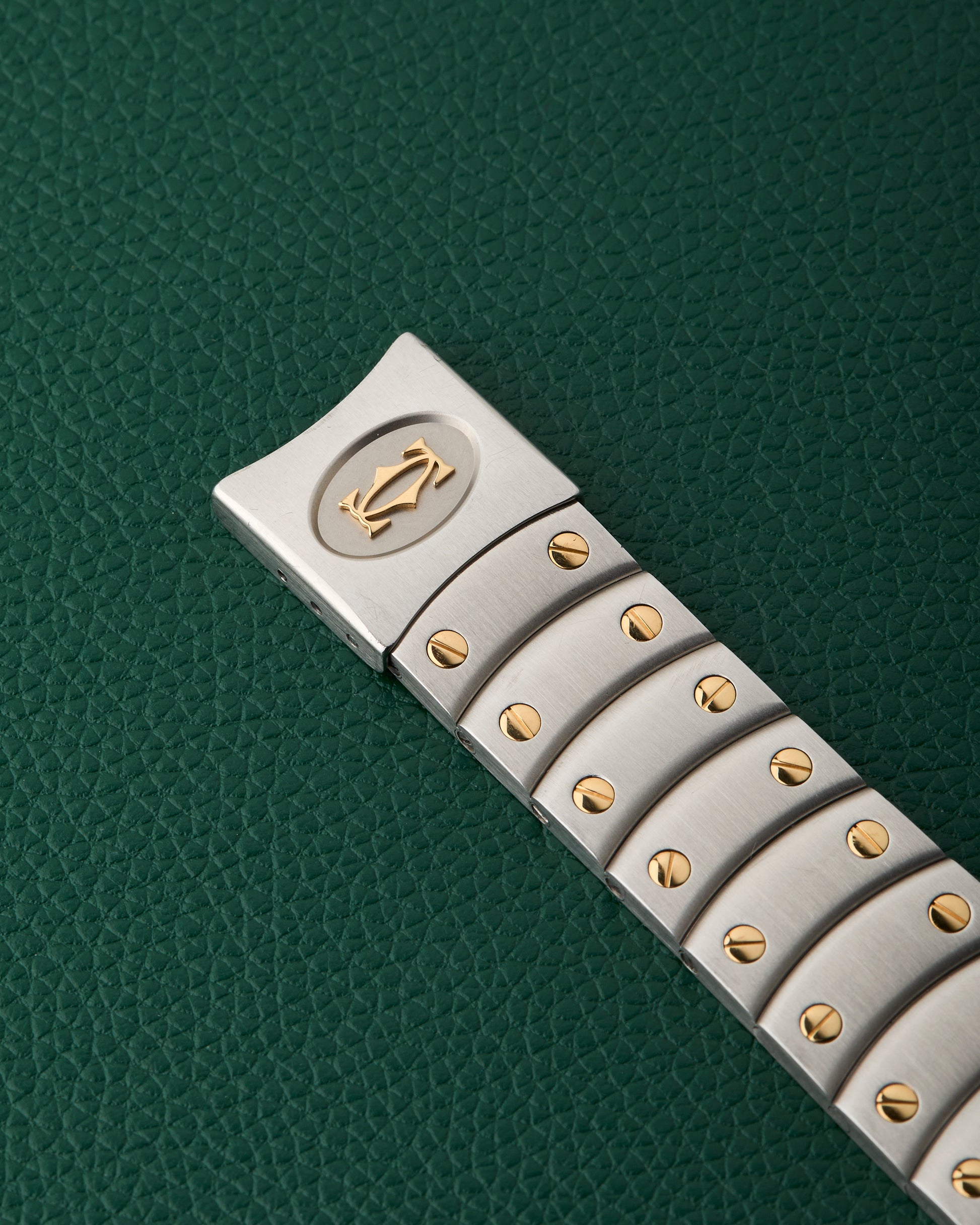 It comes with the original Cartier 18k yellow gold and stainless‑steel two‑tone bracelet and the original Cartier‑signed folding clasp.