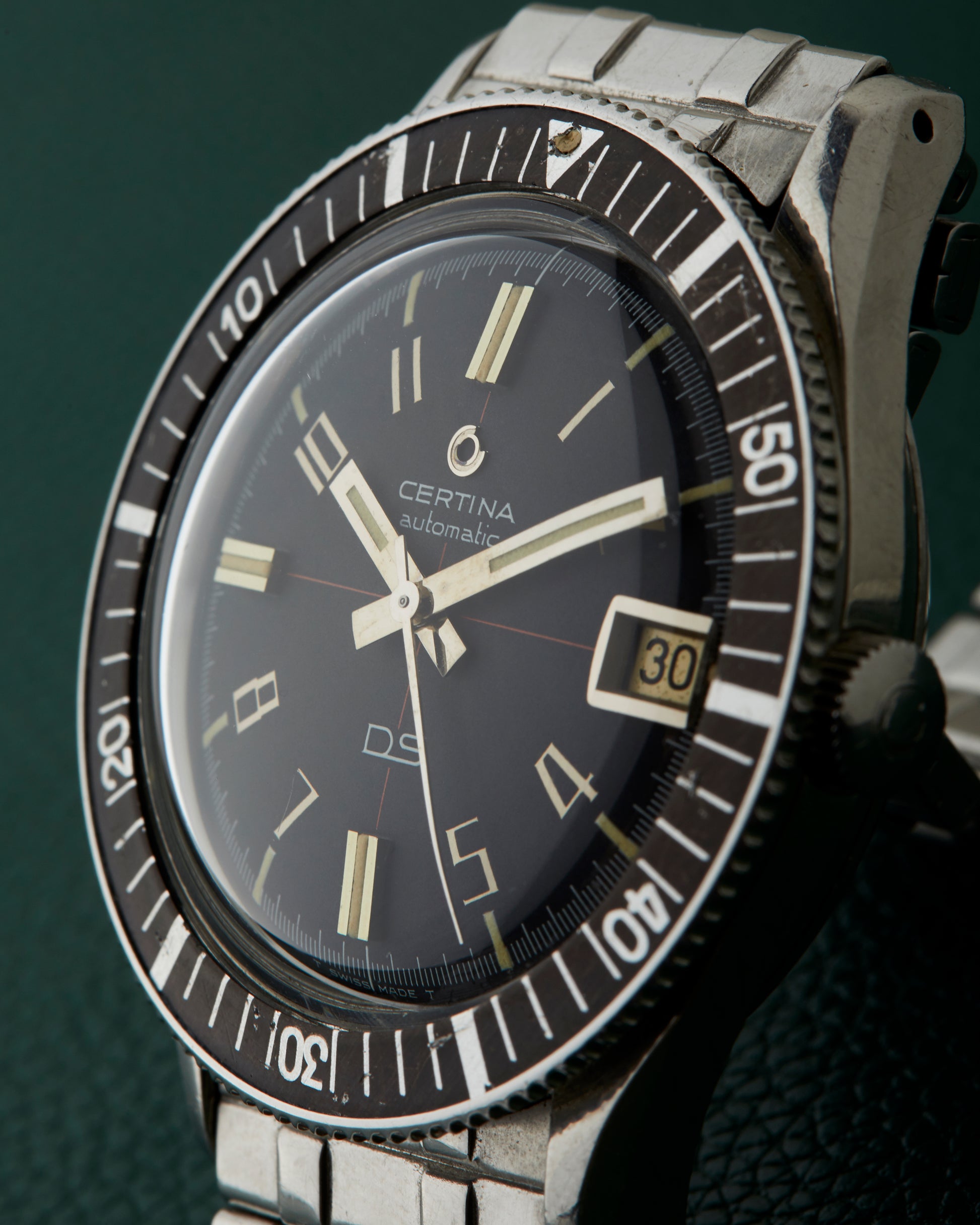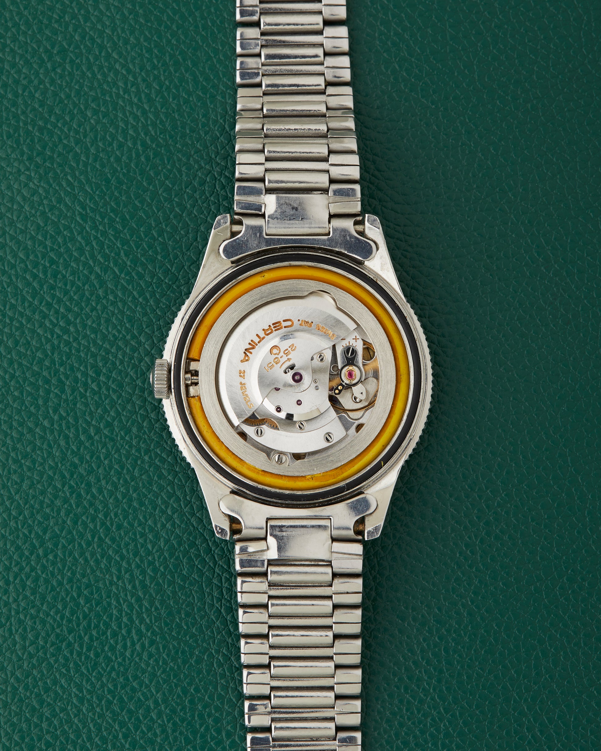 Our present Certina with the reference 5801113 has a 39mm case and features a desirable rotating bezel.