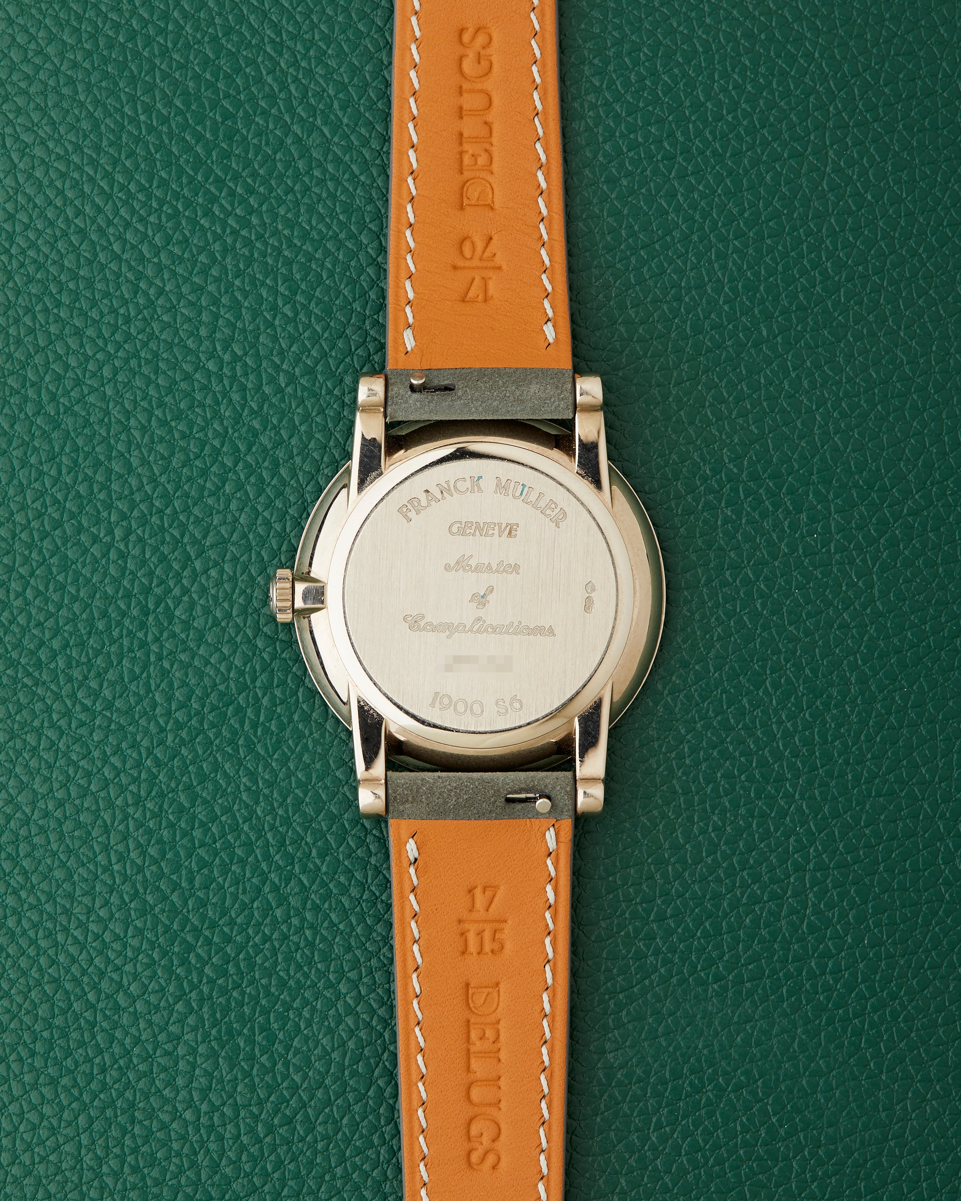 On the 18k white gold caseback there is an elegant engraving Franck Muller Geneve Master of Complications.