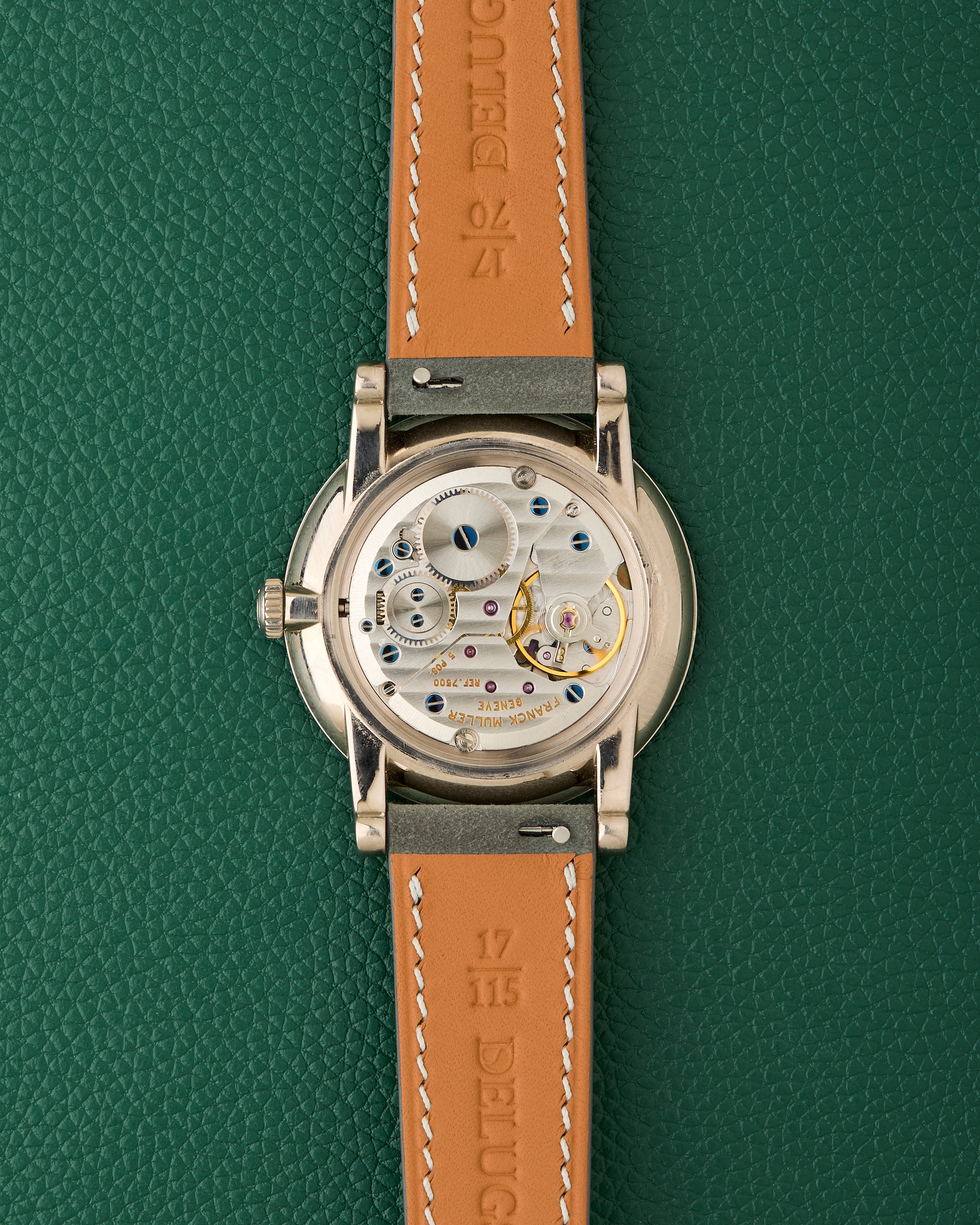 Inside beats Frank Muller signed calibre 7500 manual winding movement.