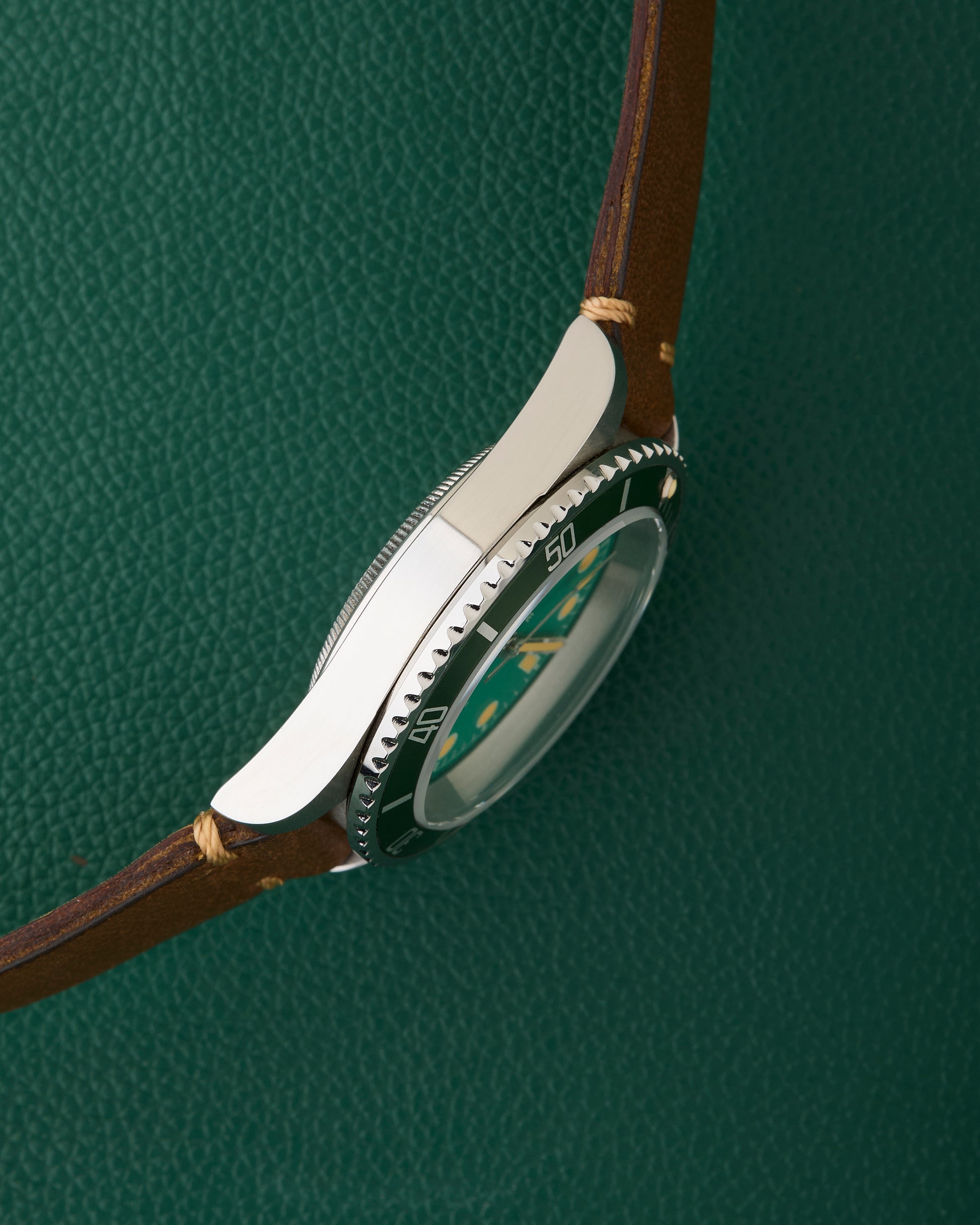 Our present Freese watch with an extremely attractive green that contrasts beautifully with its warm yellow hands and indices, creating a look that’s both playful and refined. This example was one of the later watches he made in the original run of this model.