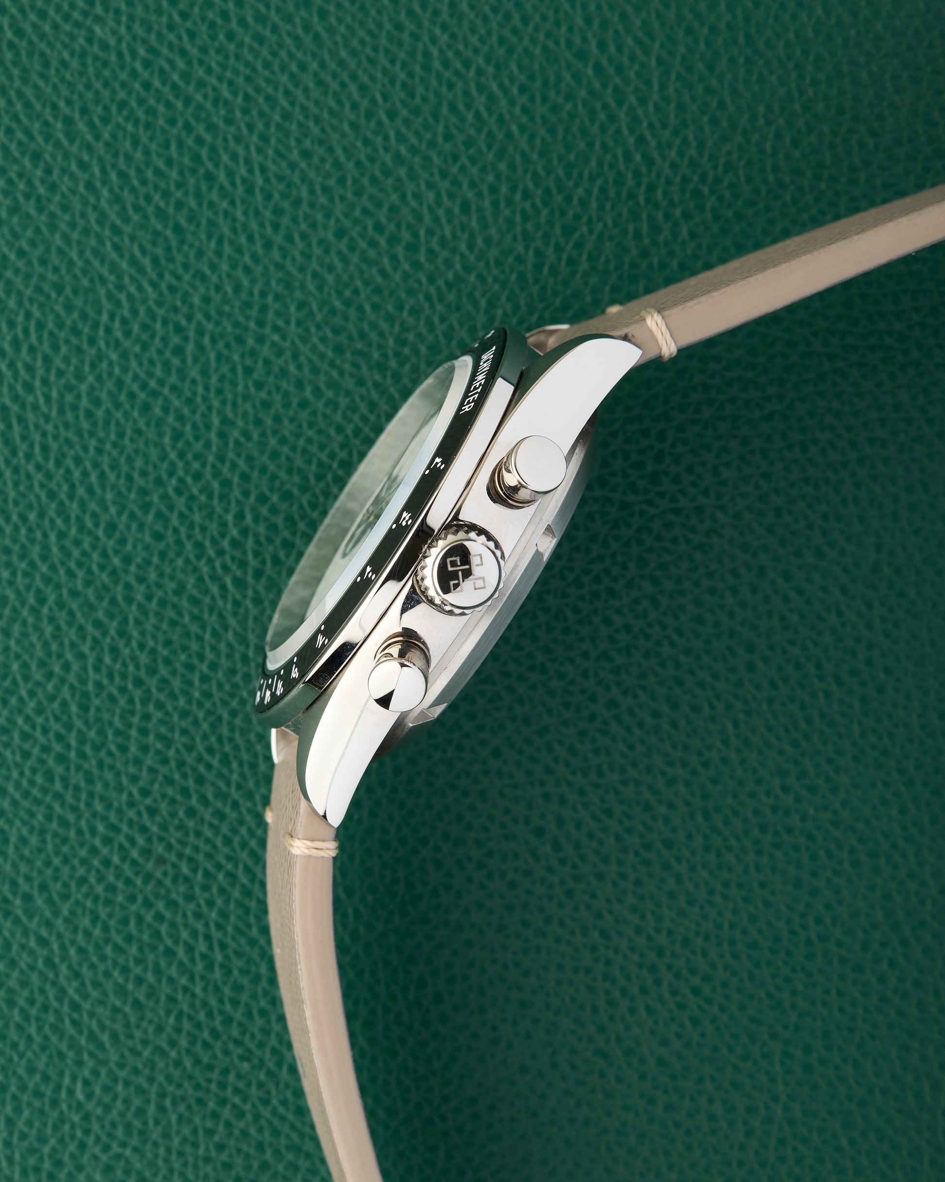 The Tachymeter bezel is engraved with Hindu-Arabic numerals.