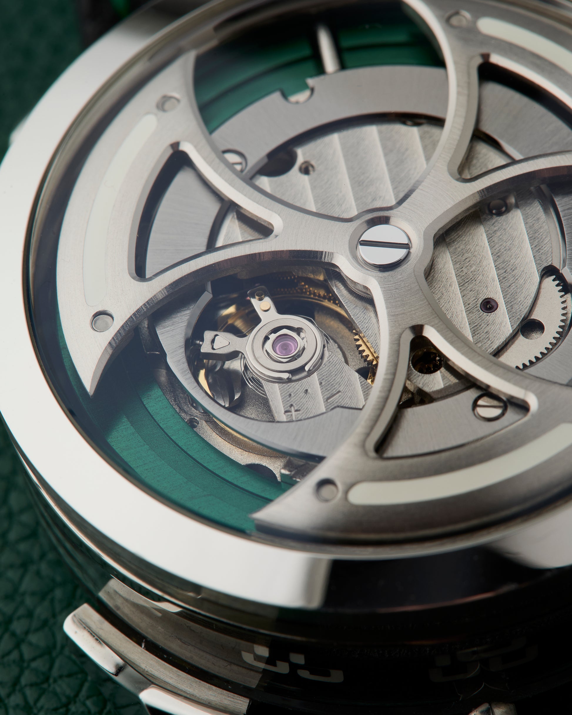 The vivid green accents and rotor add a strong visual punch, highlighting the kinetic nature of the design as it spins during wear.