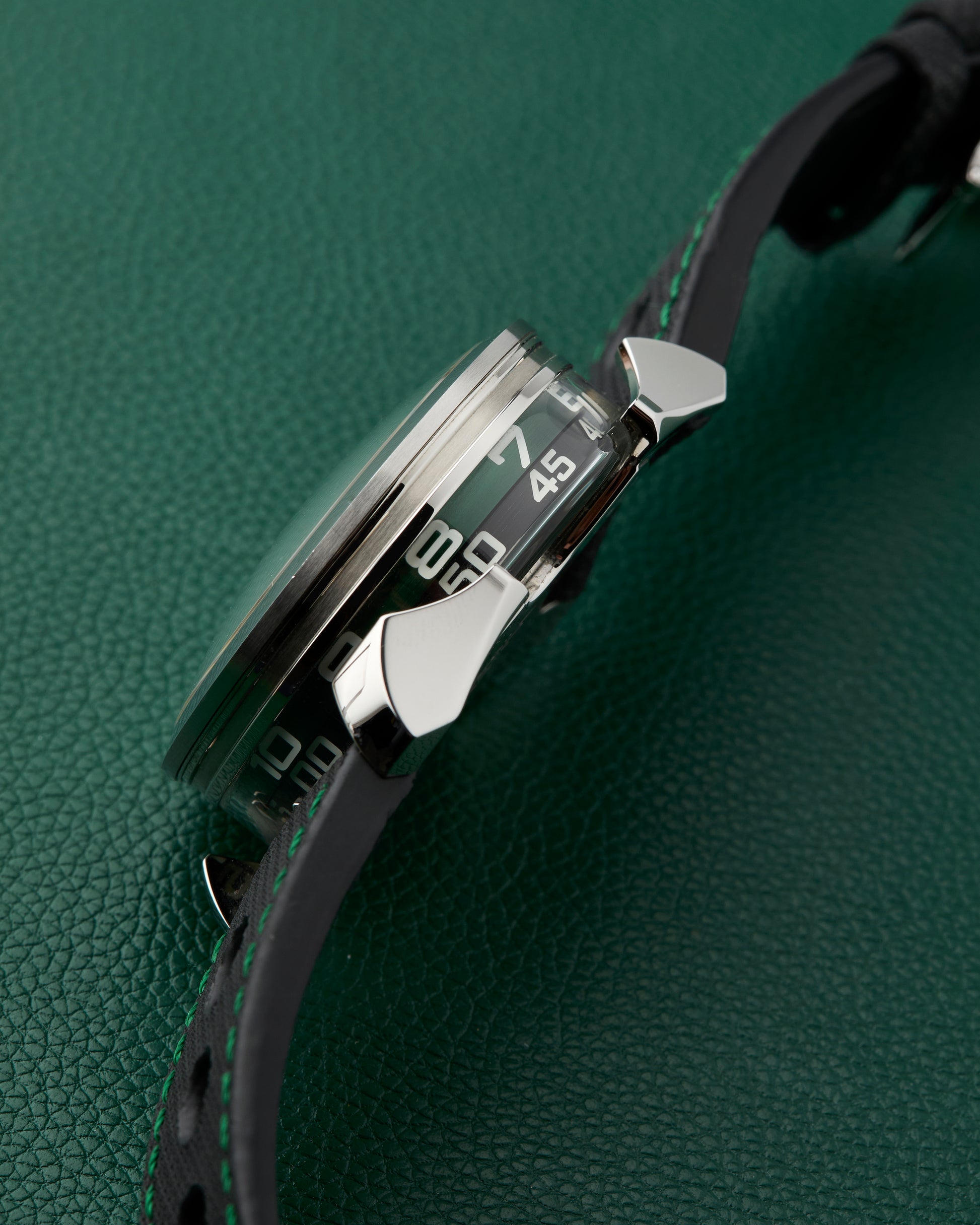 Our present MB&F M.A.D. Editions Green M.A.D.1 features the hours and minutes on the side of the case.