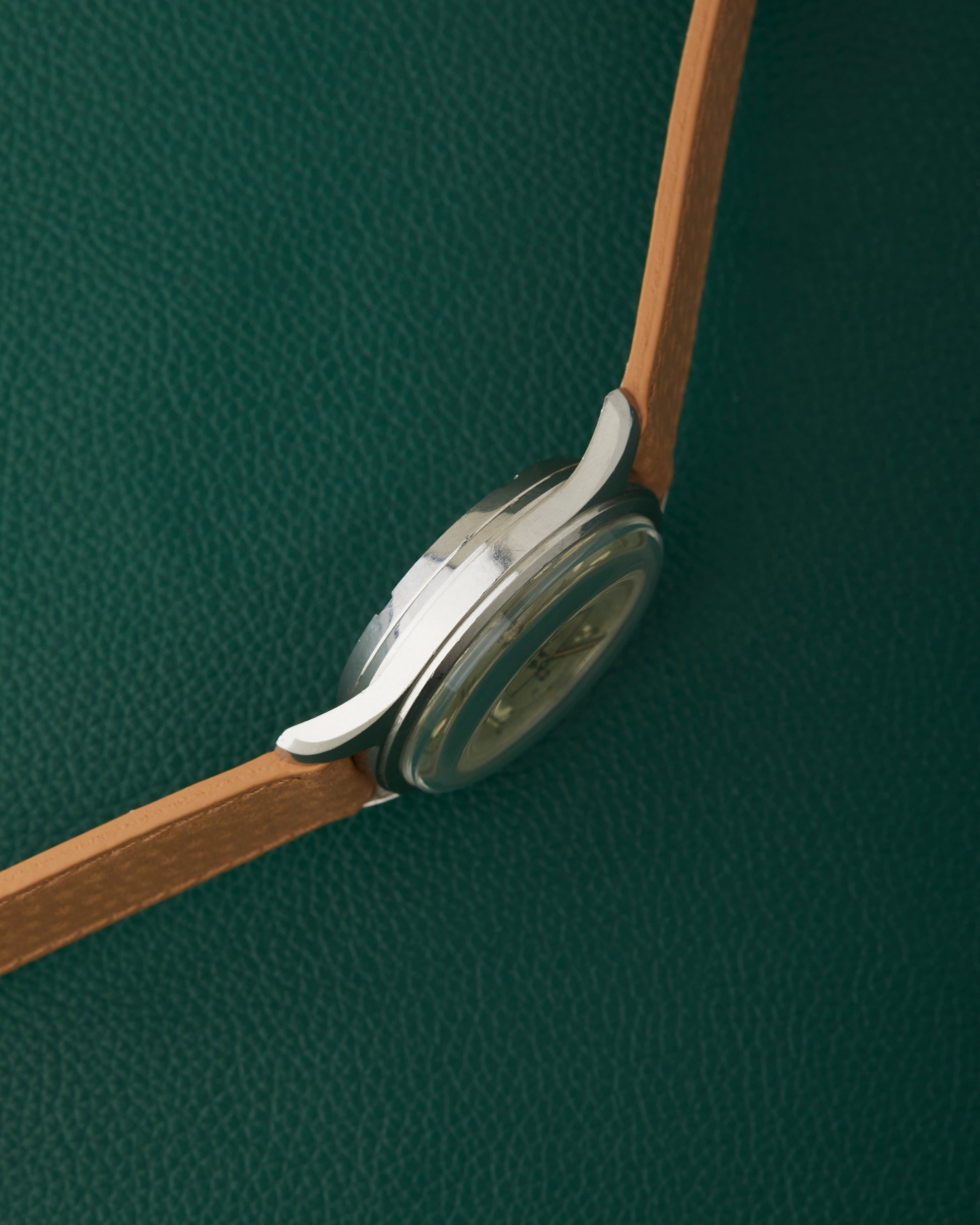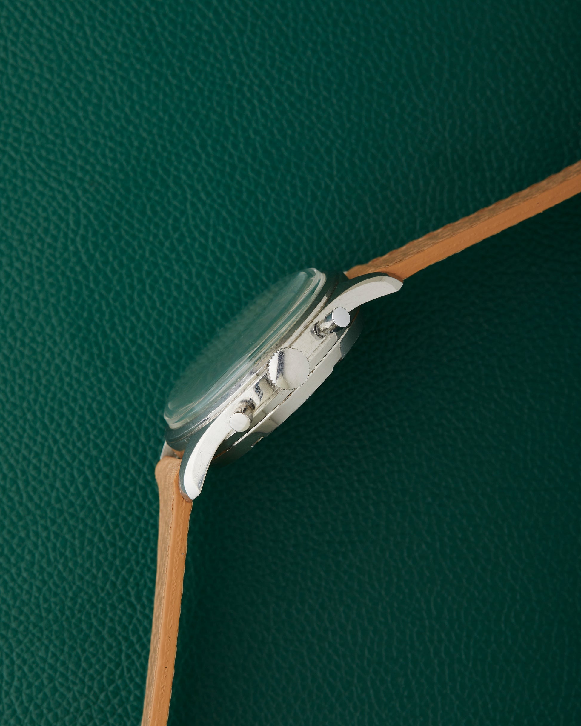 Comes on a light brown calf leather strap with colour matched stitching by SM Urban Straps.
