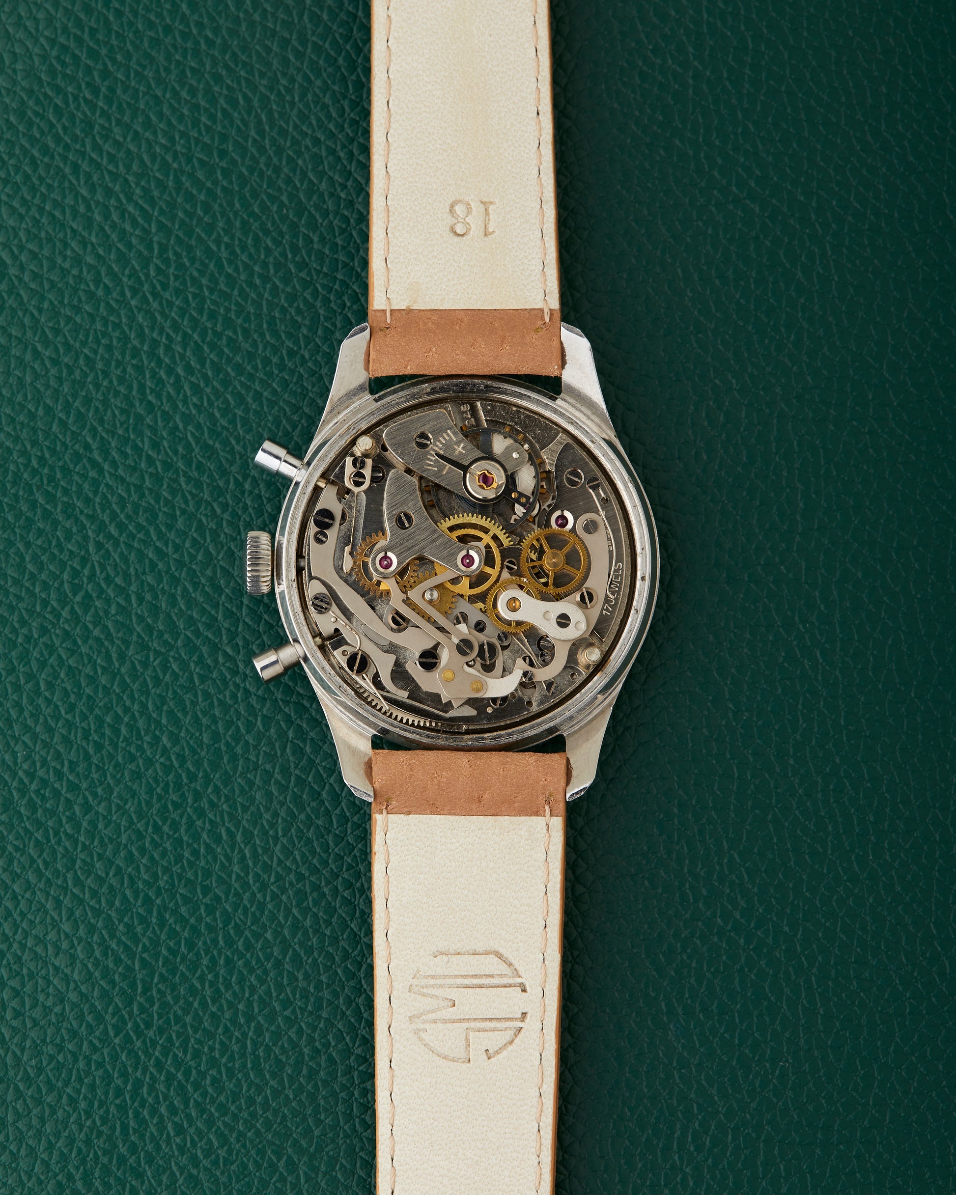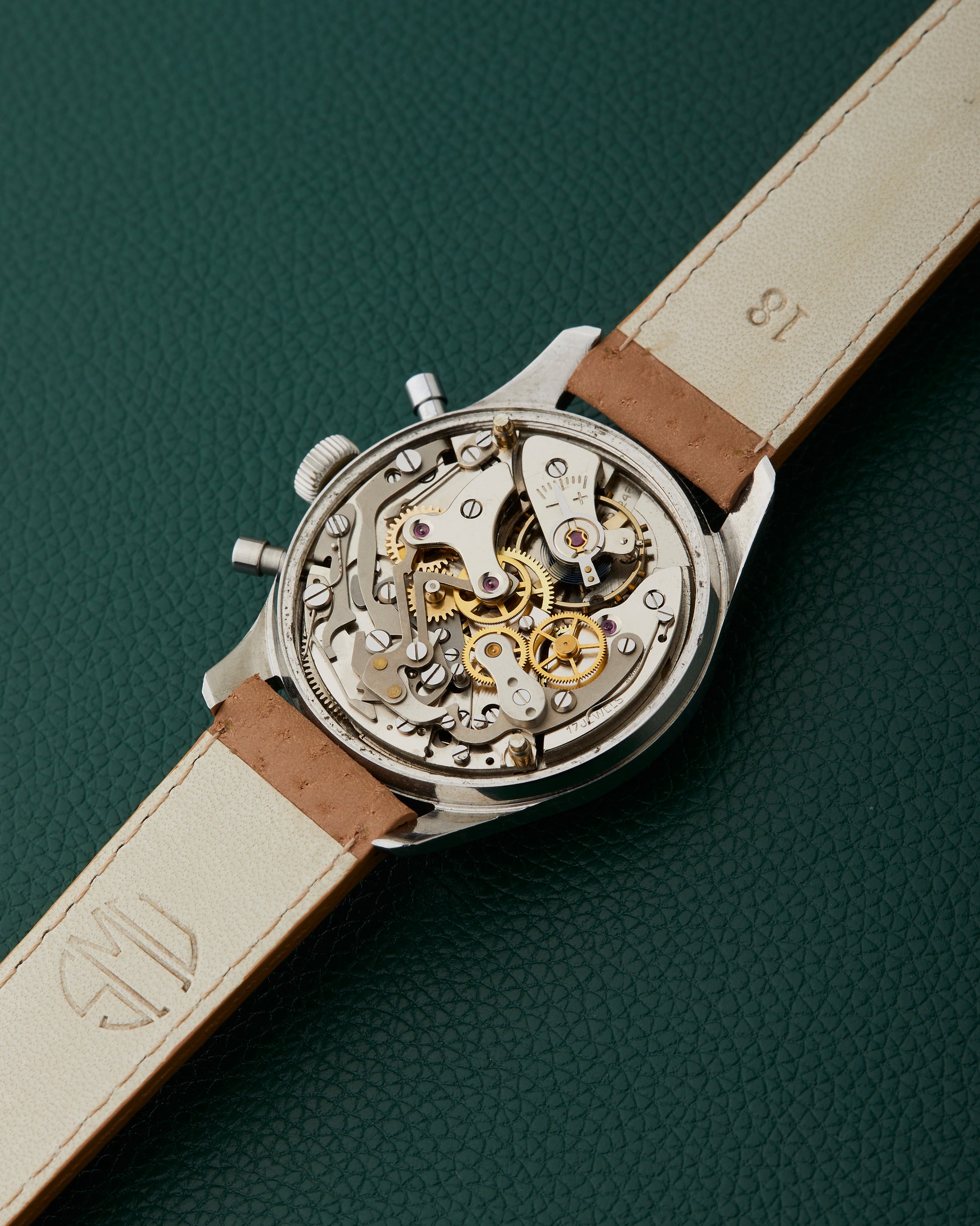 Inside beats the Landeron calibre 248 manual winding chronograph movement.