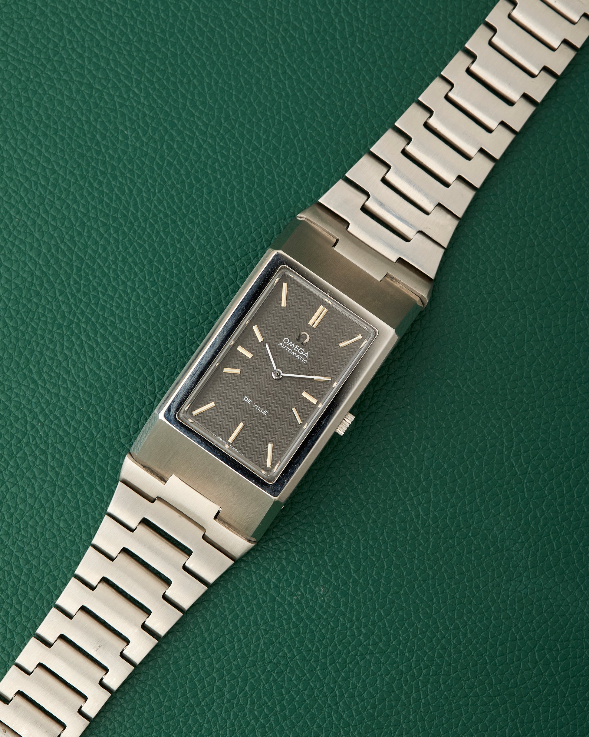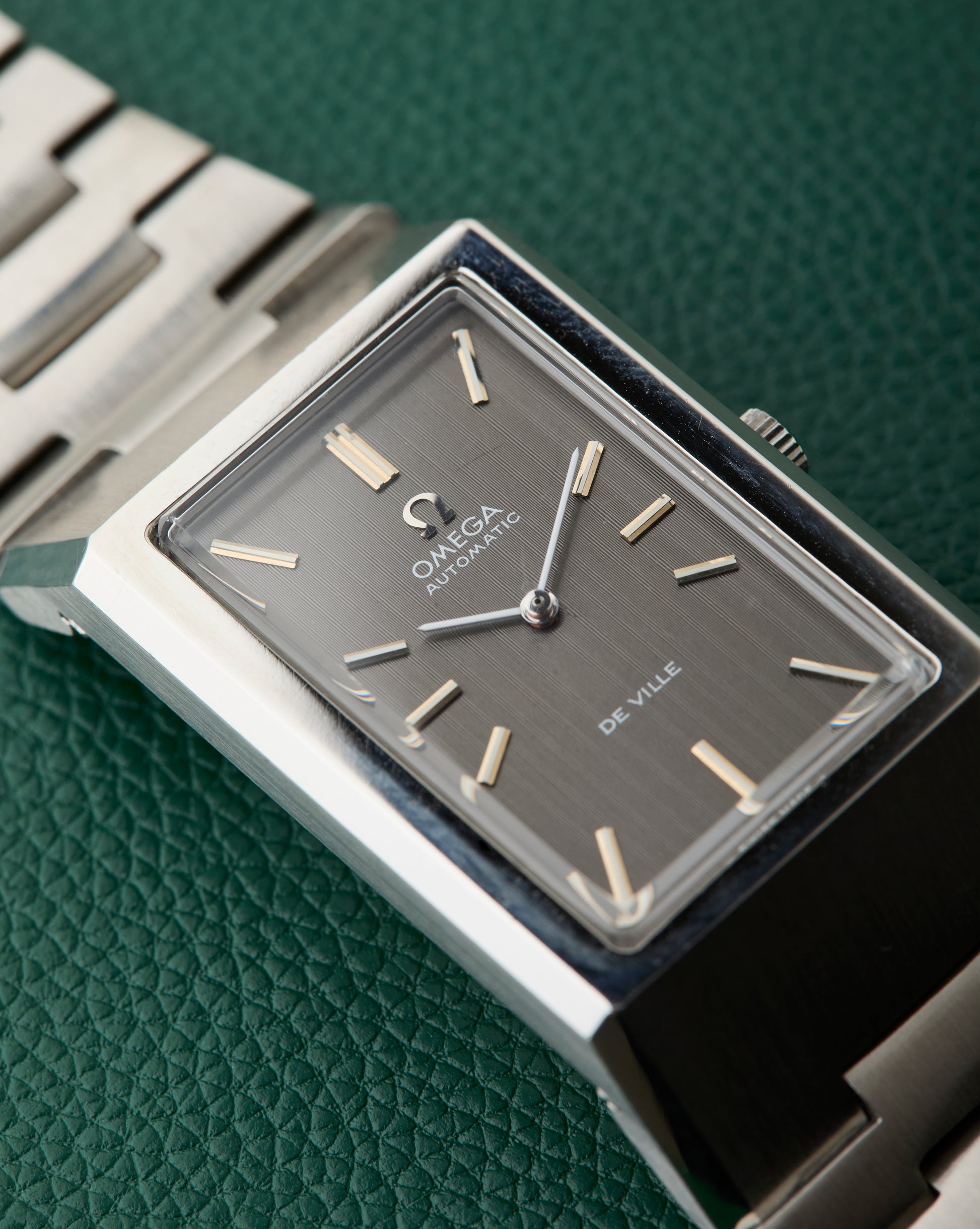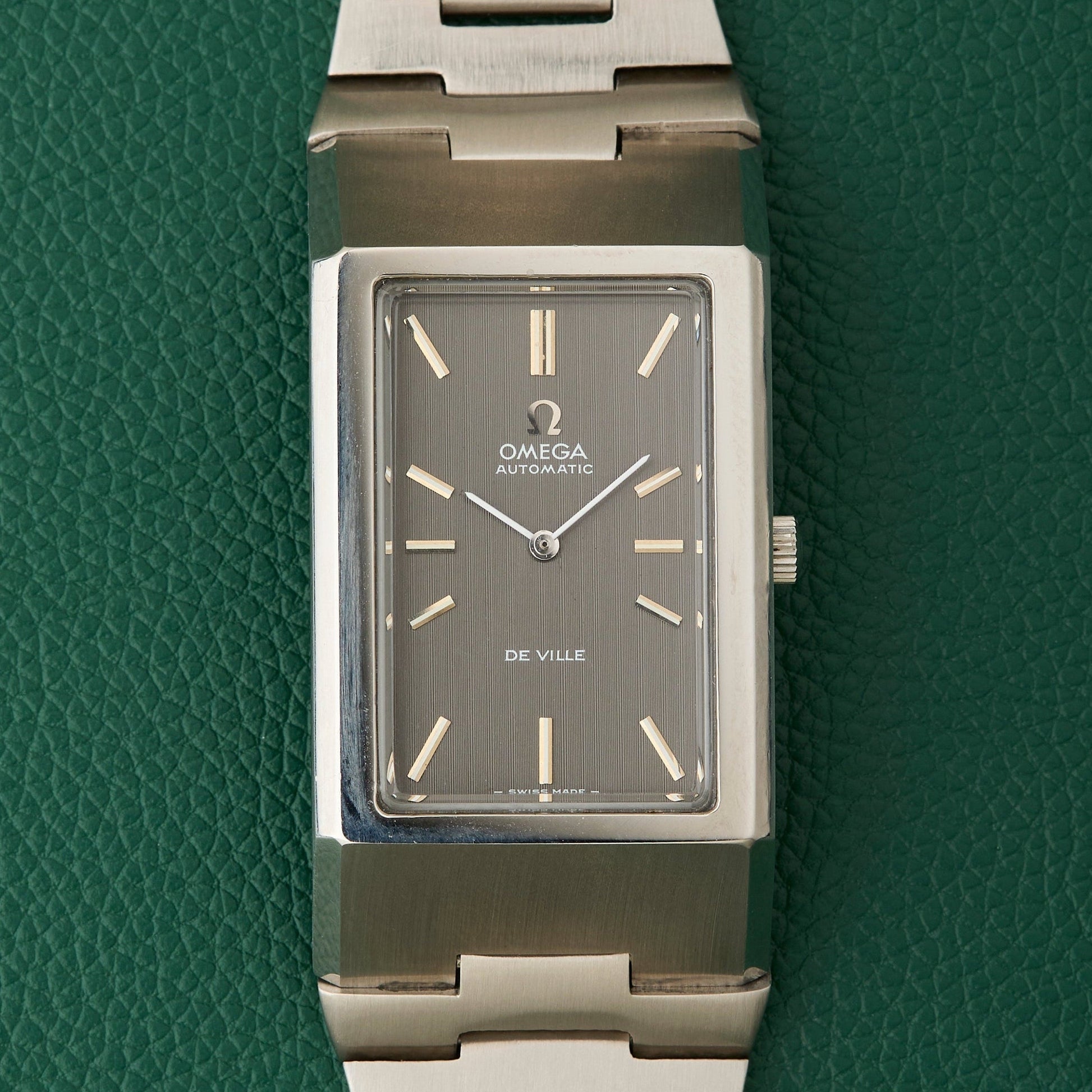 Our present Omega DeVille reference 155.007 features a slate grey dial with quirky lined hour markers.