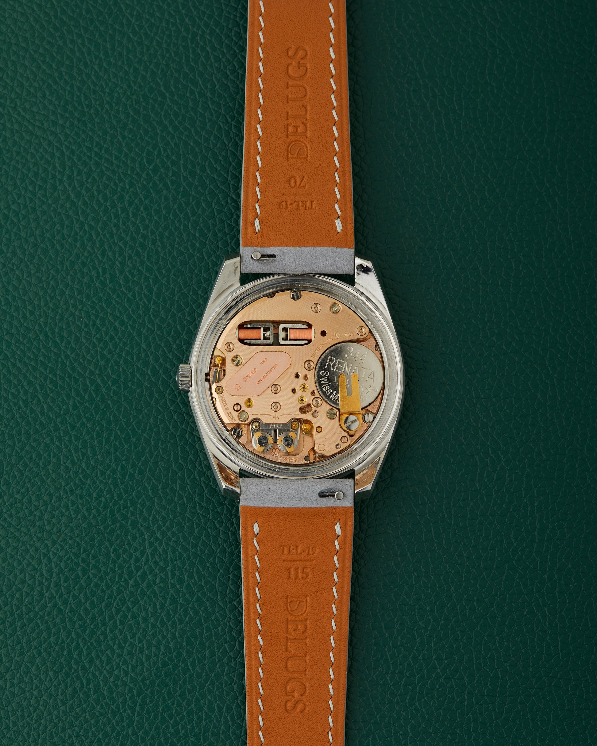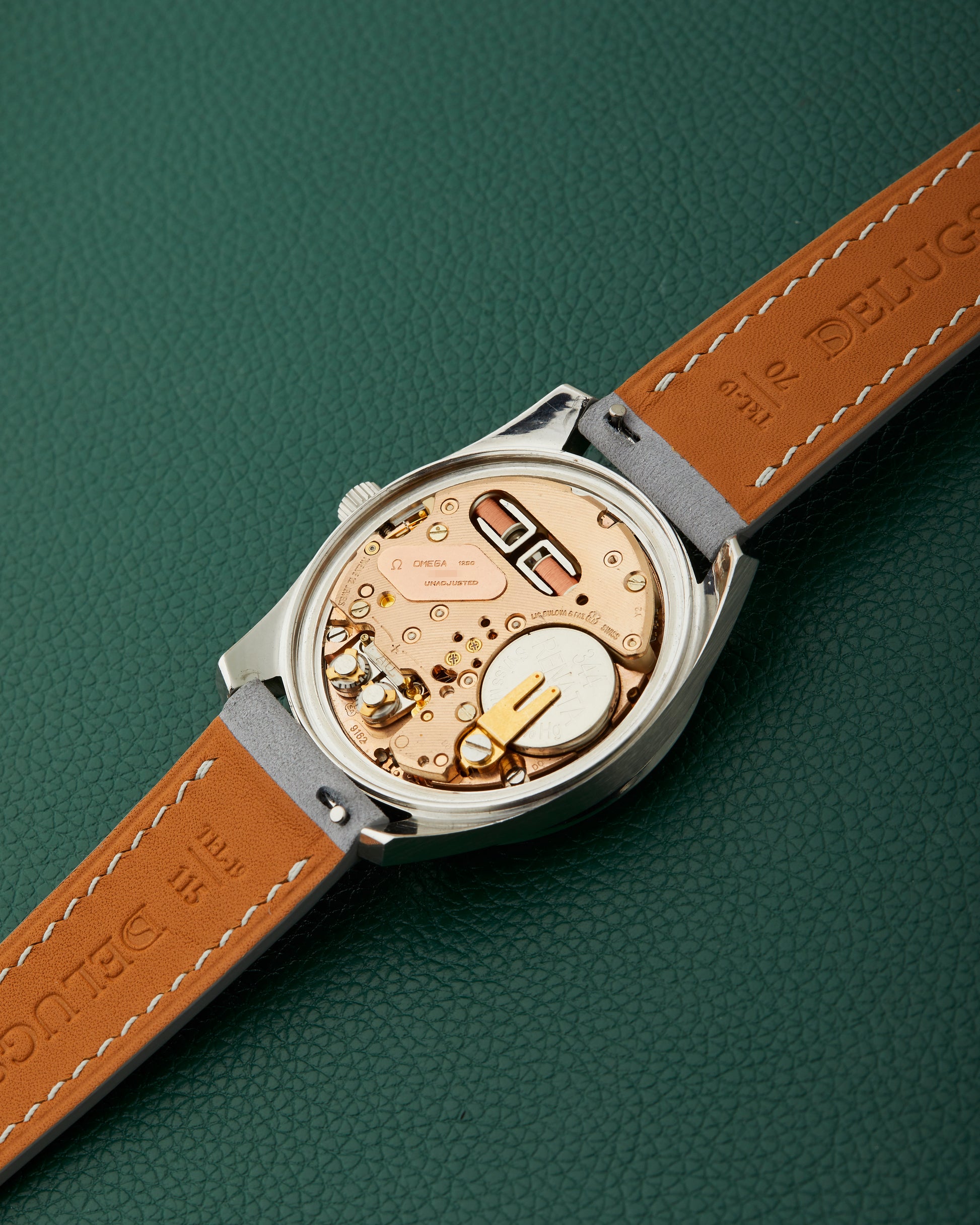 Inside beats the Omega calibre 1250 electronic tuning fork movement.