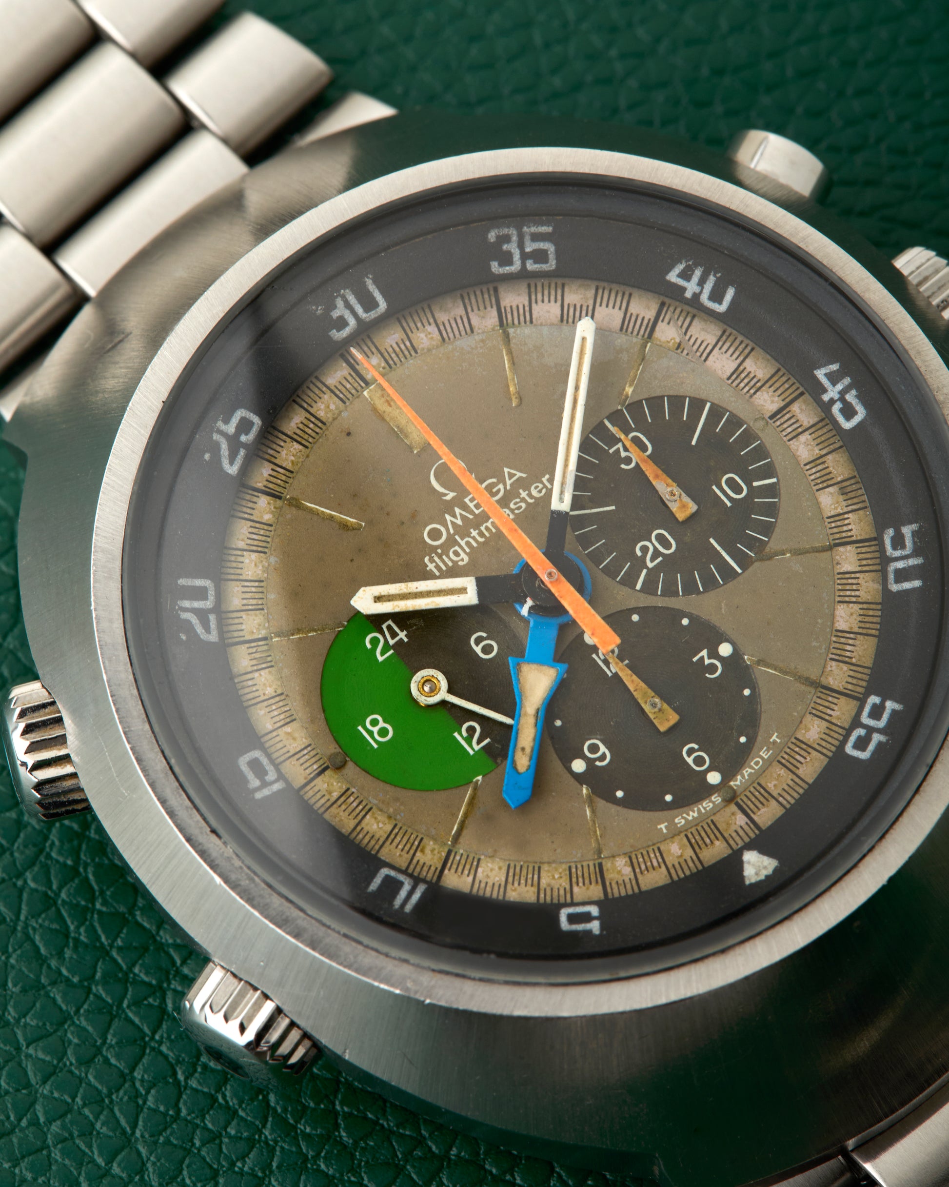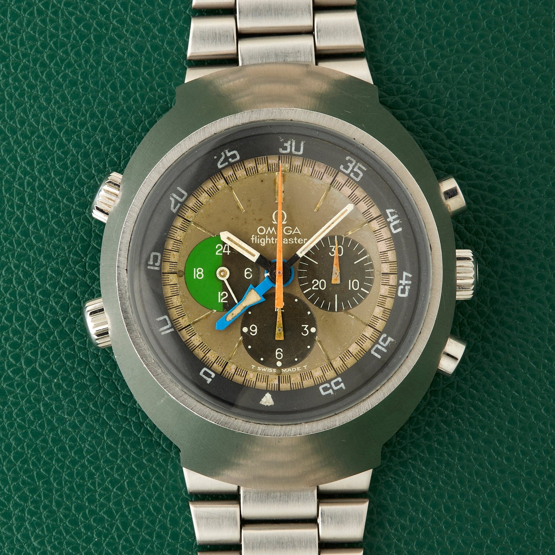 This Omega Flightmaster reference 145.013 chronograph features an exquisite brown aged dial. The contrasting subdials add a vintage character to this timepiece.