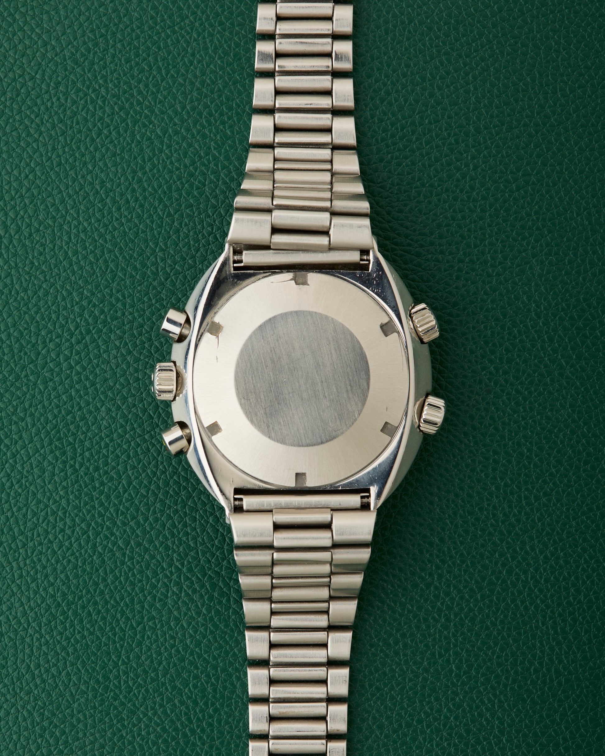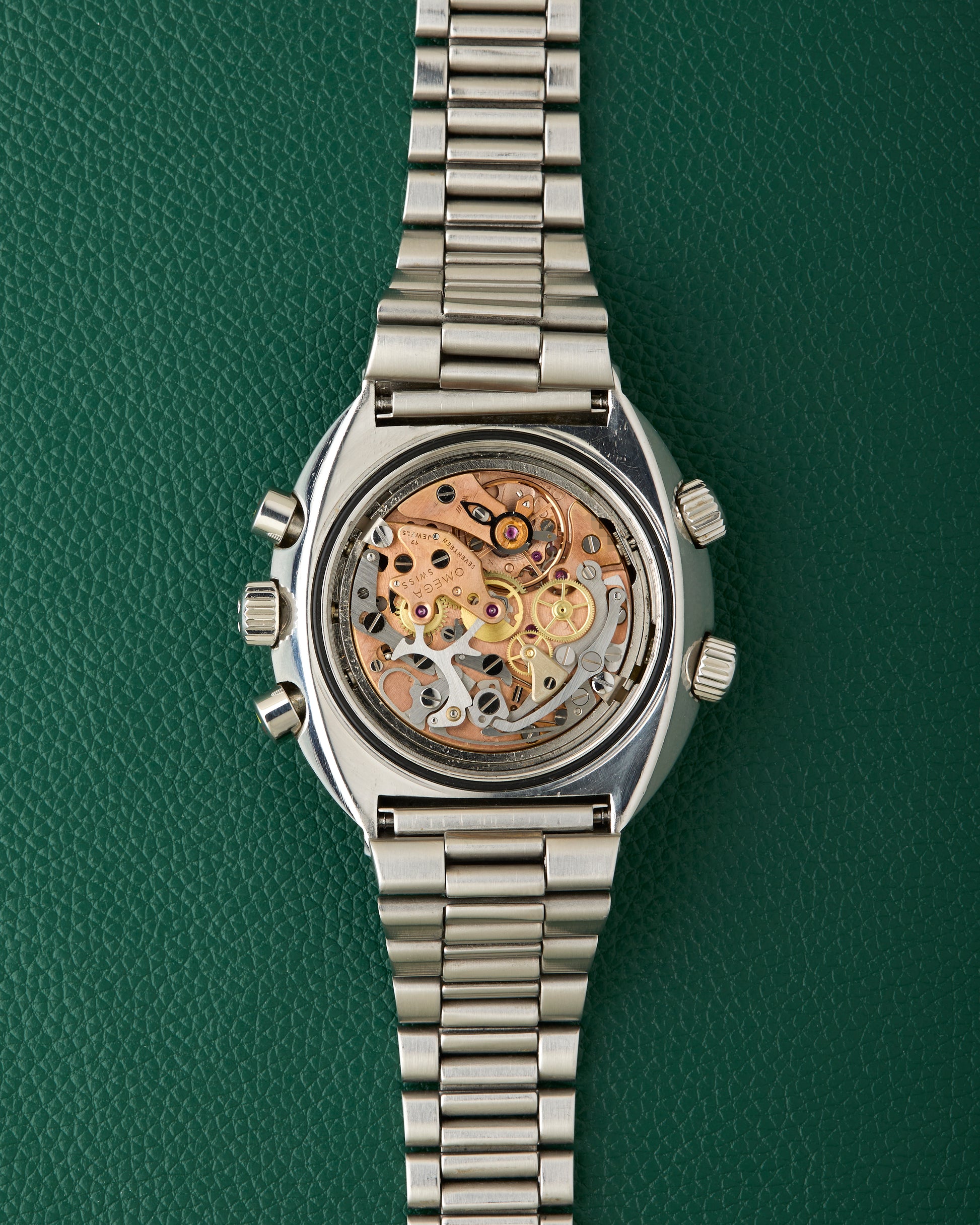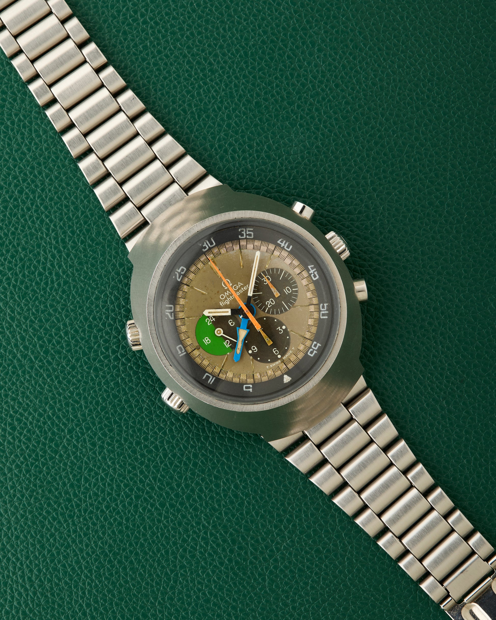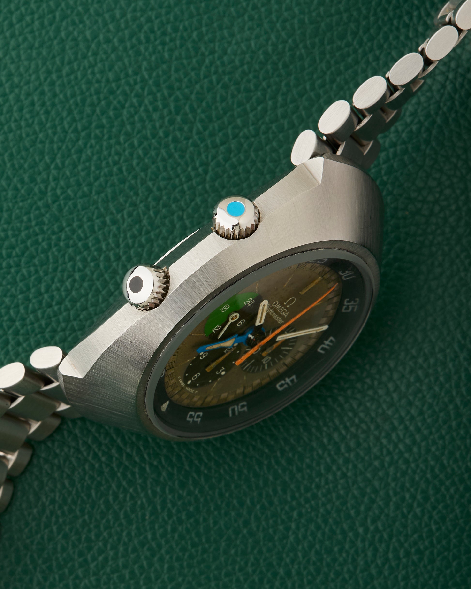 It's 43mm stainless steel case presents well, is fitted with an Omega signed crown and coloured pushers.