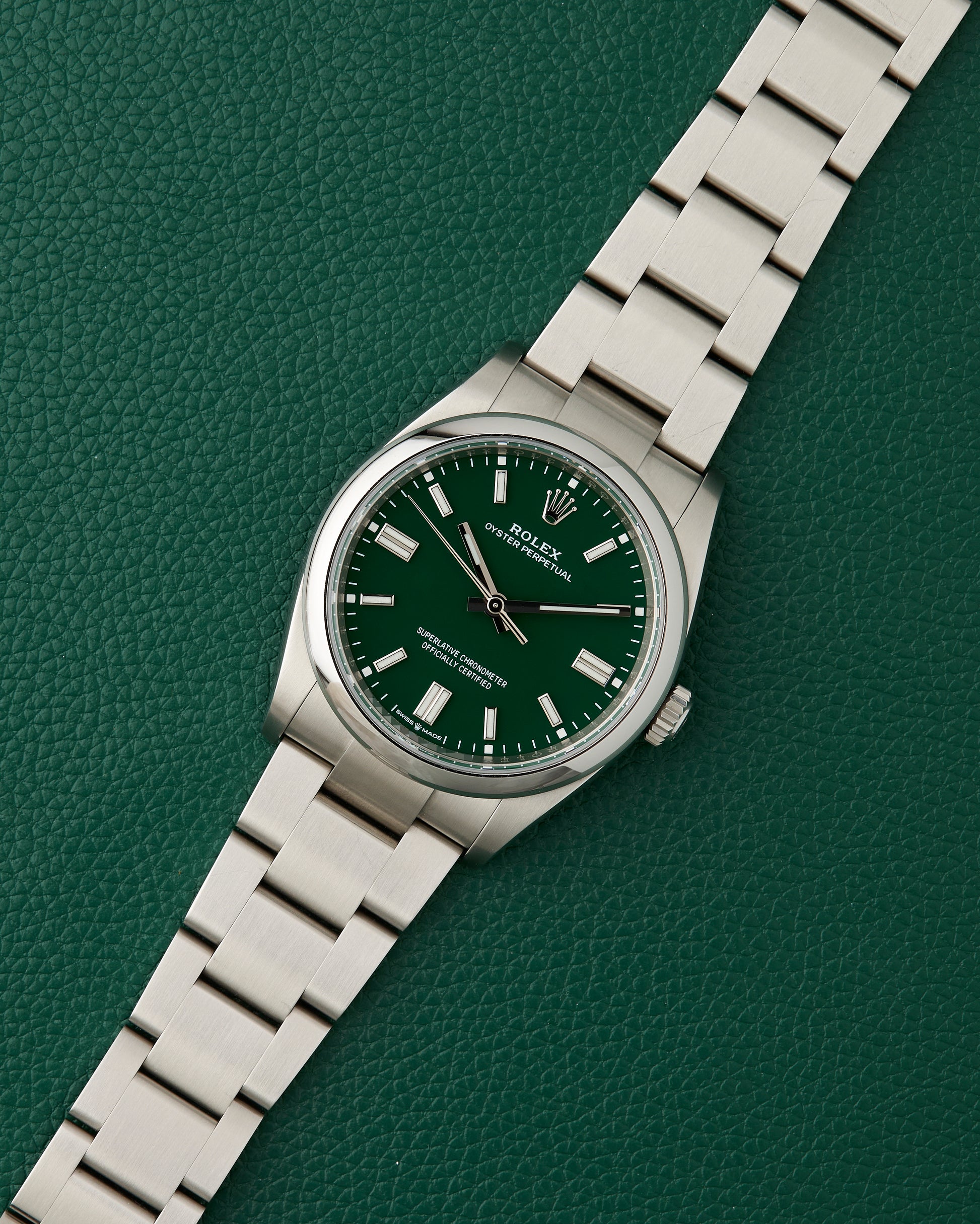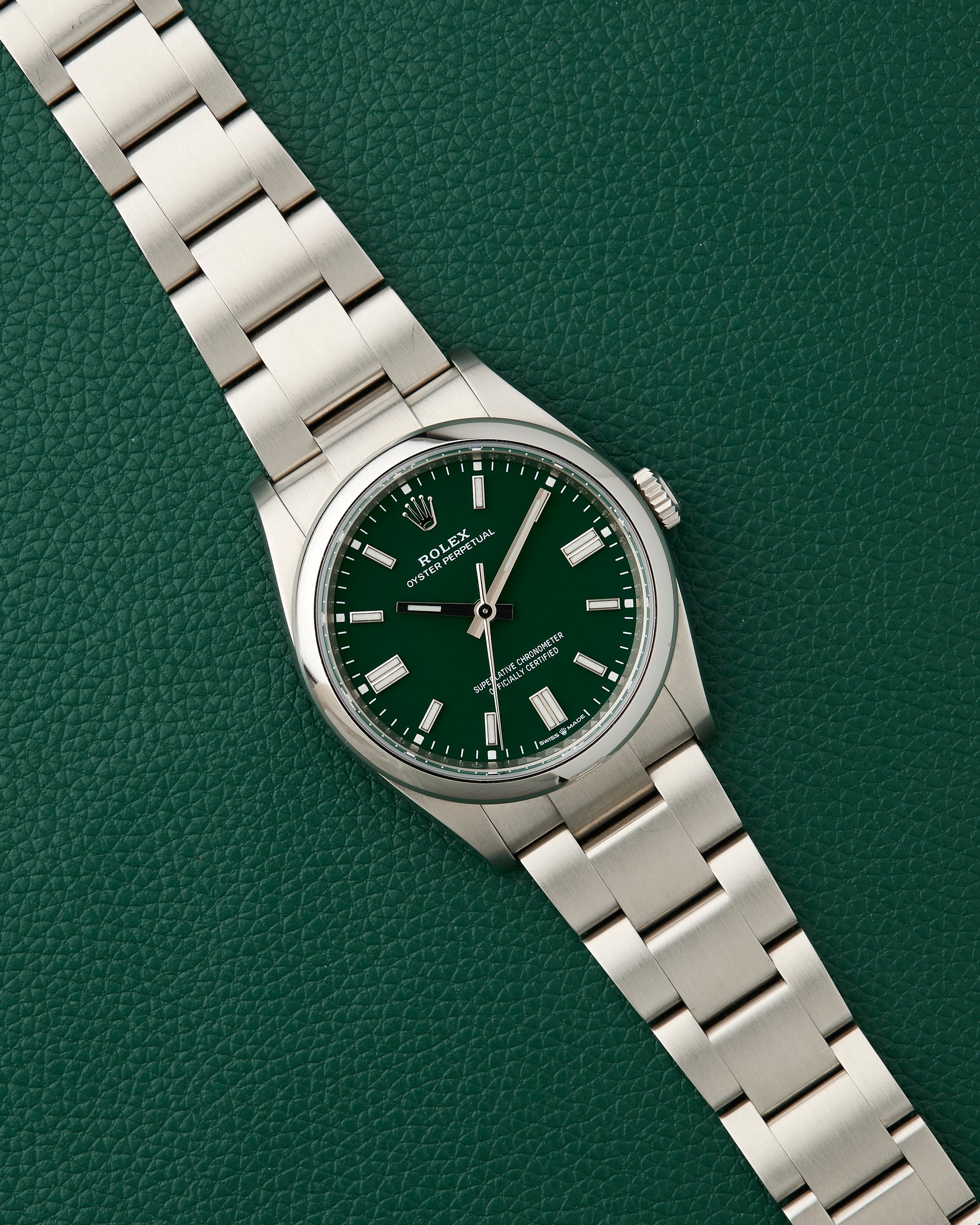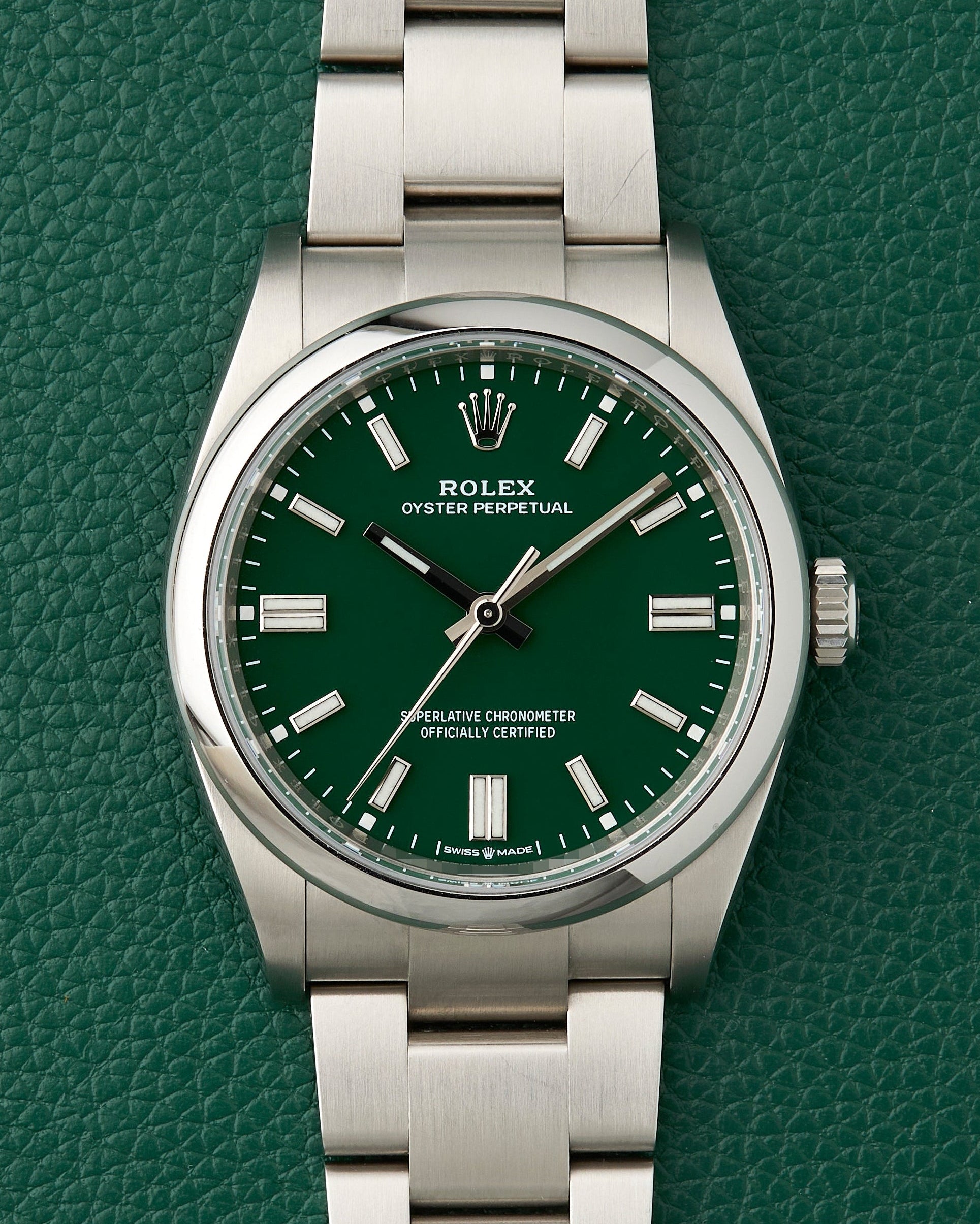 Our present Rolex Oyster Perpetual with the reference 126000 features an attractive green dial, giving a fun look to the classic brand.