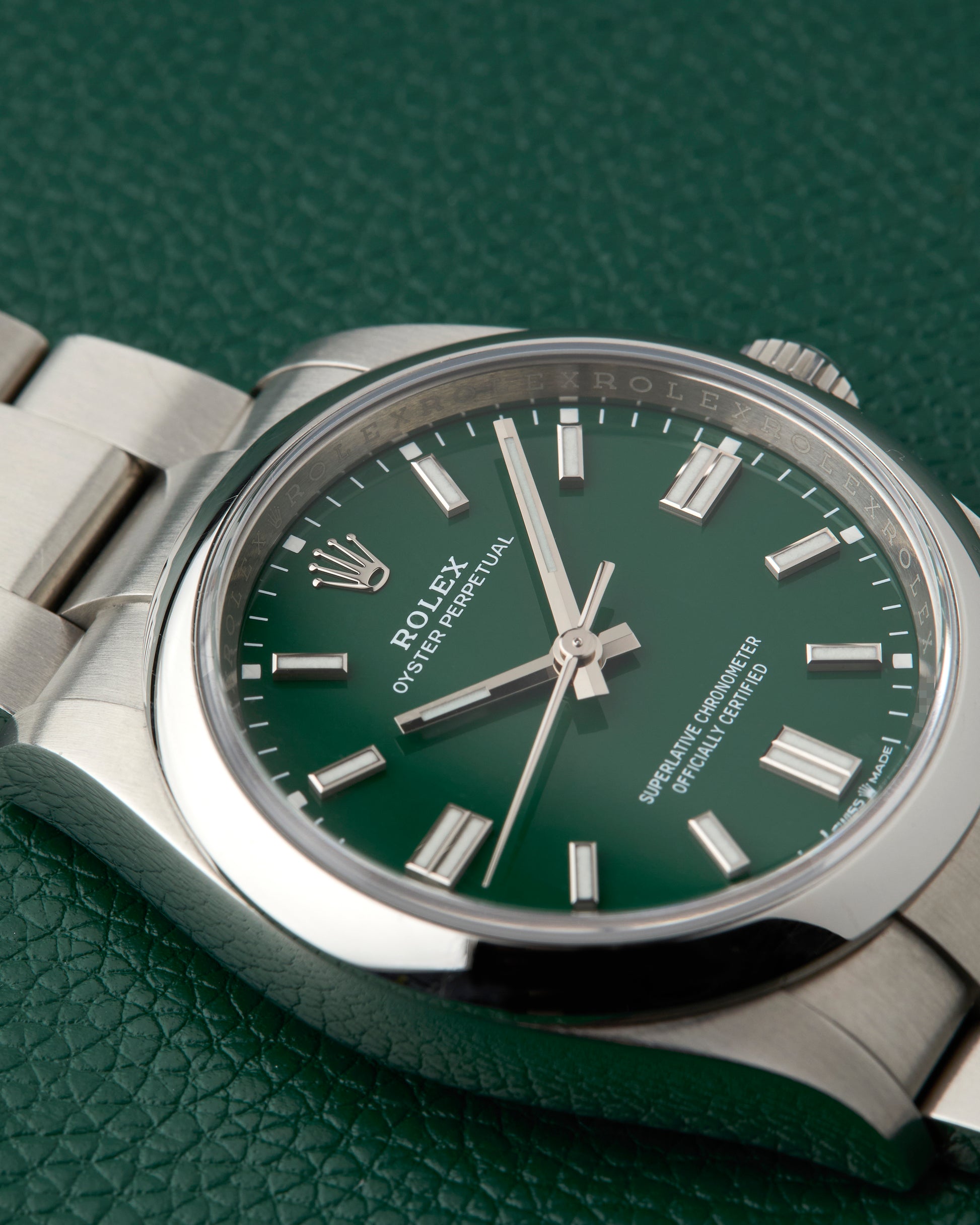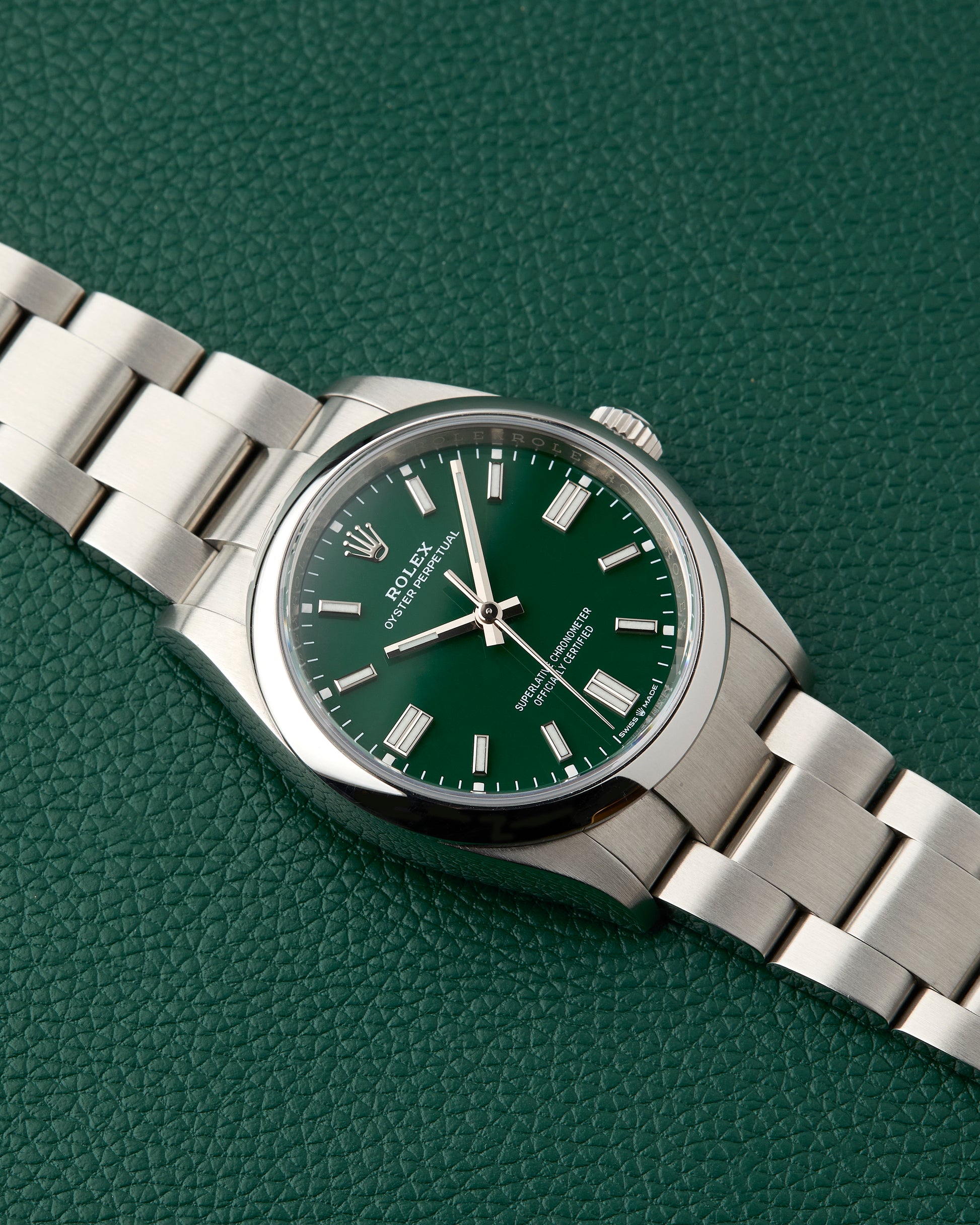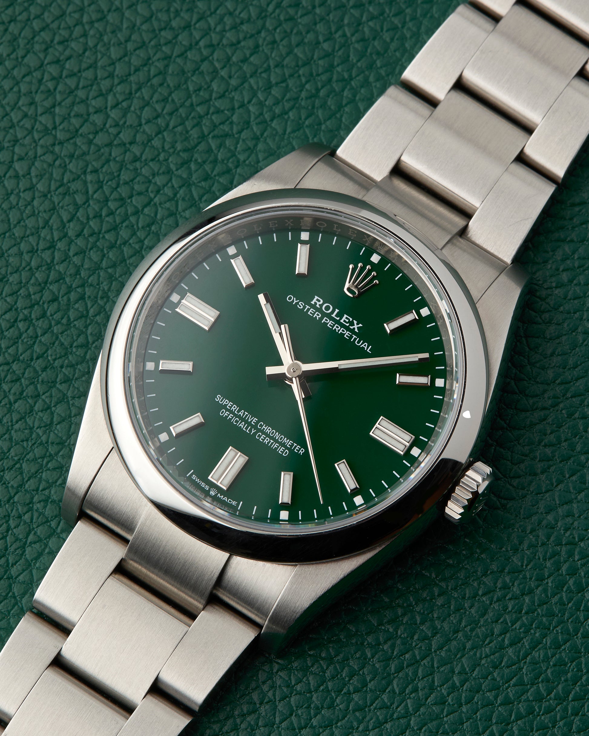 Our present Rolex Oyster Perpetual with the reference 126000 features an attractive green dial, giving a fun look to the classic brand.