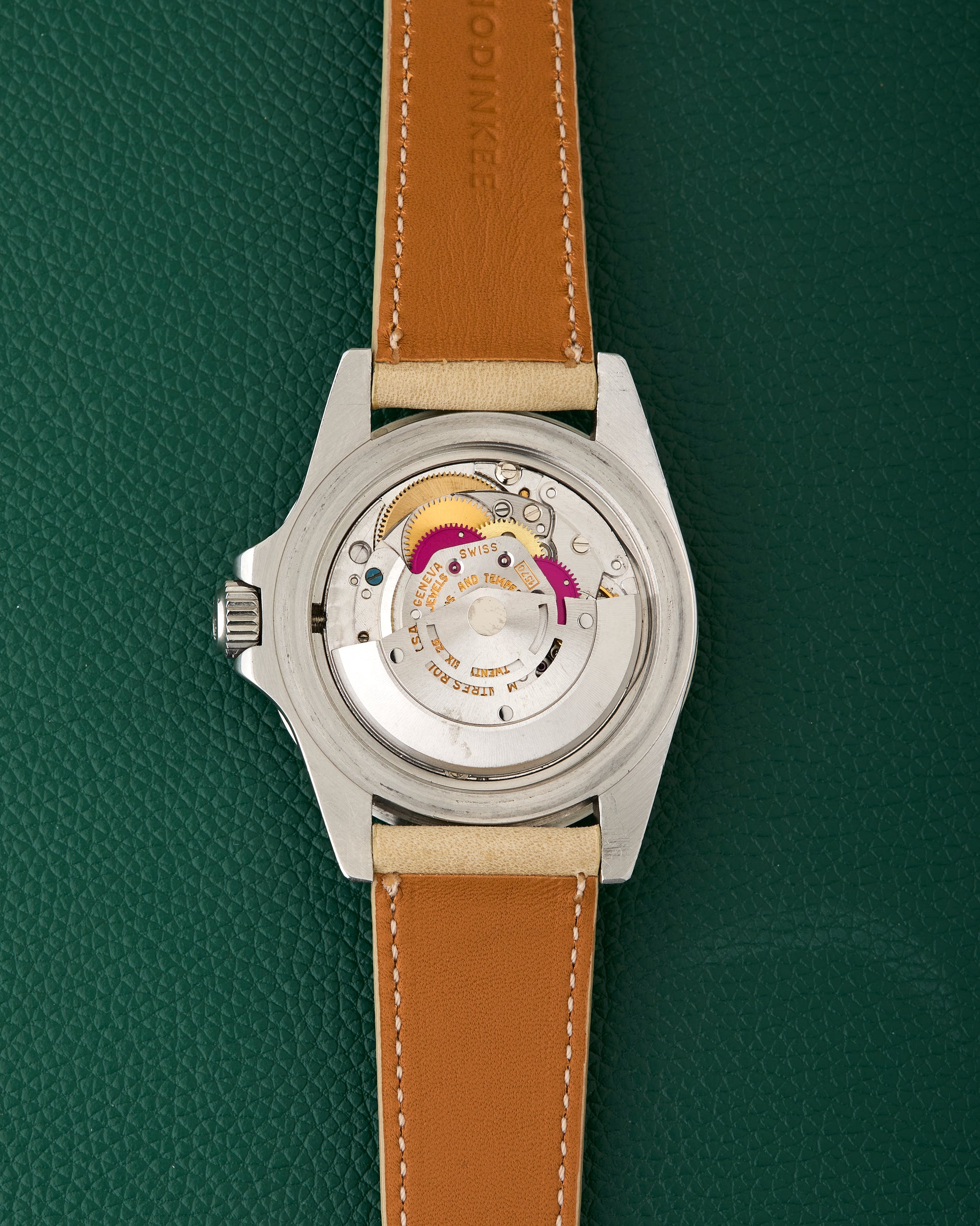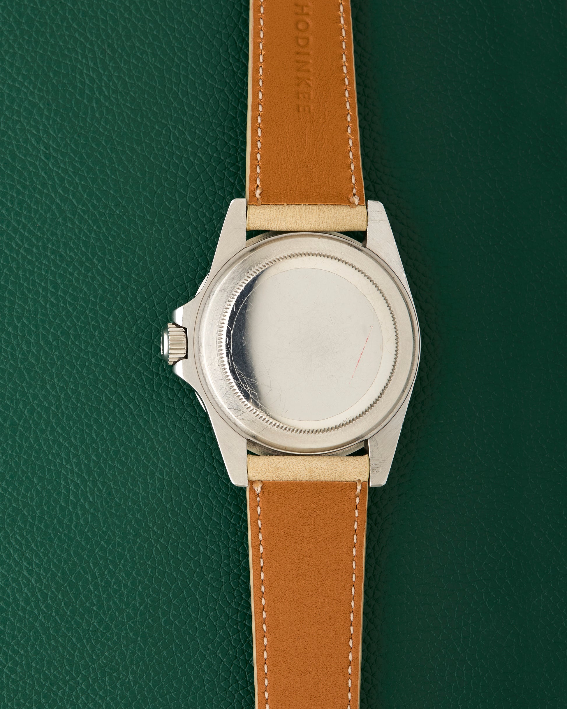 Comes fitted on a Hodinkee branded new leather strap in beige tone.