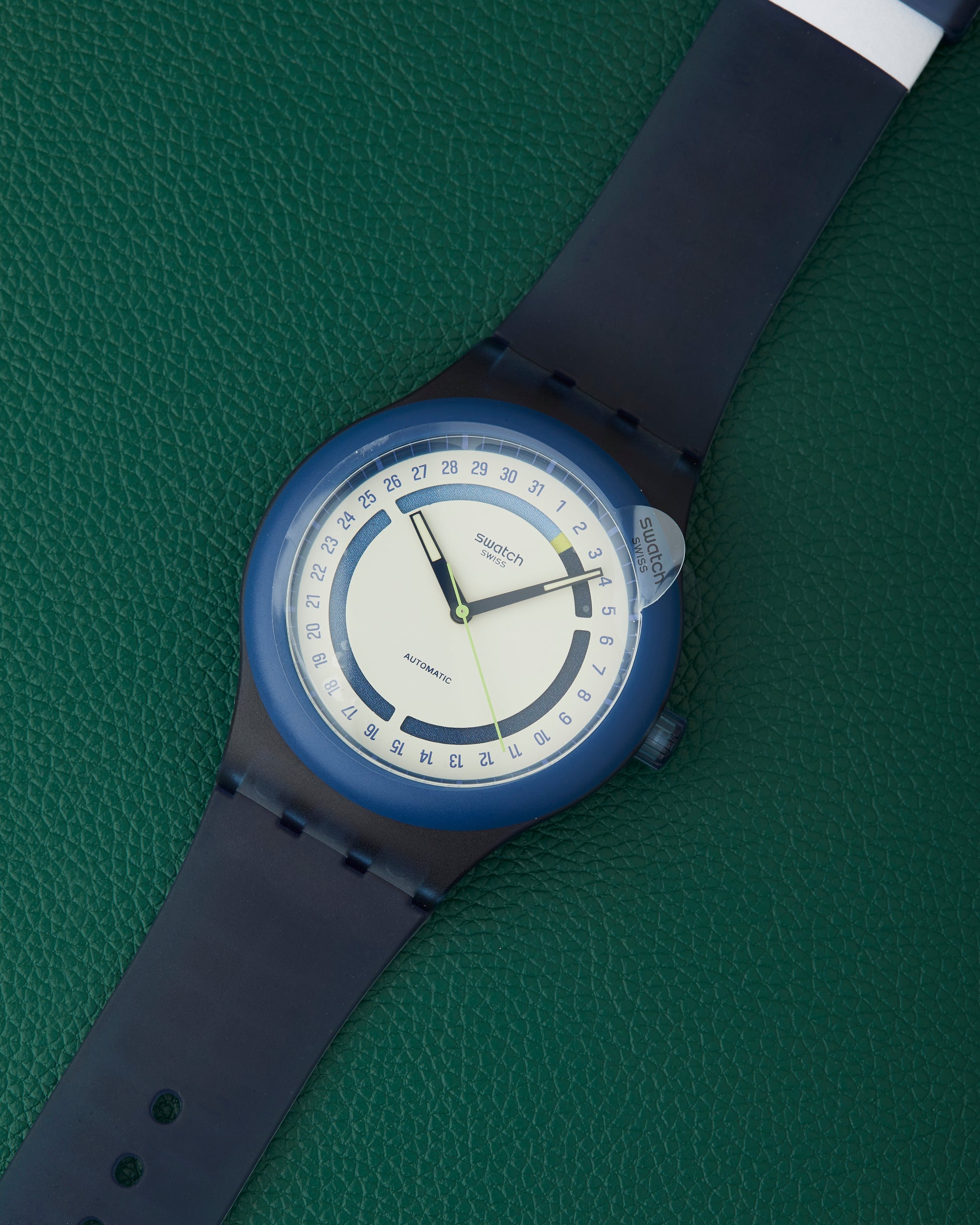 In unworn condition, the 42mm semi-transparent plastic case comes in a dark blue shade.