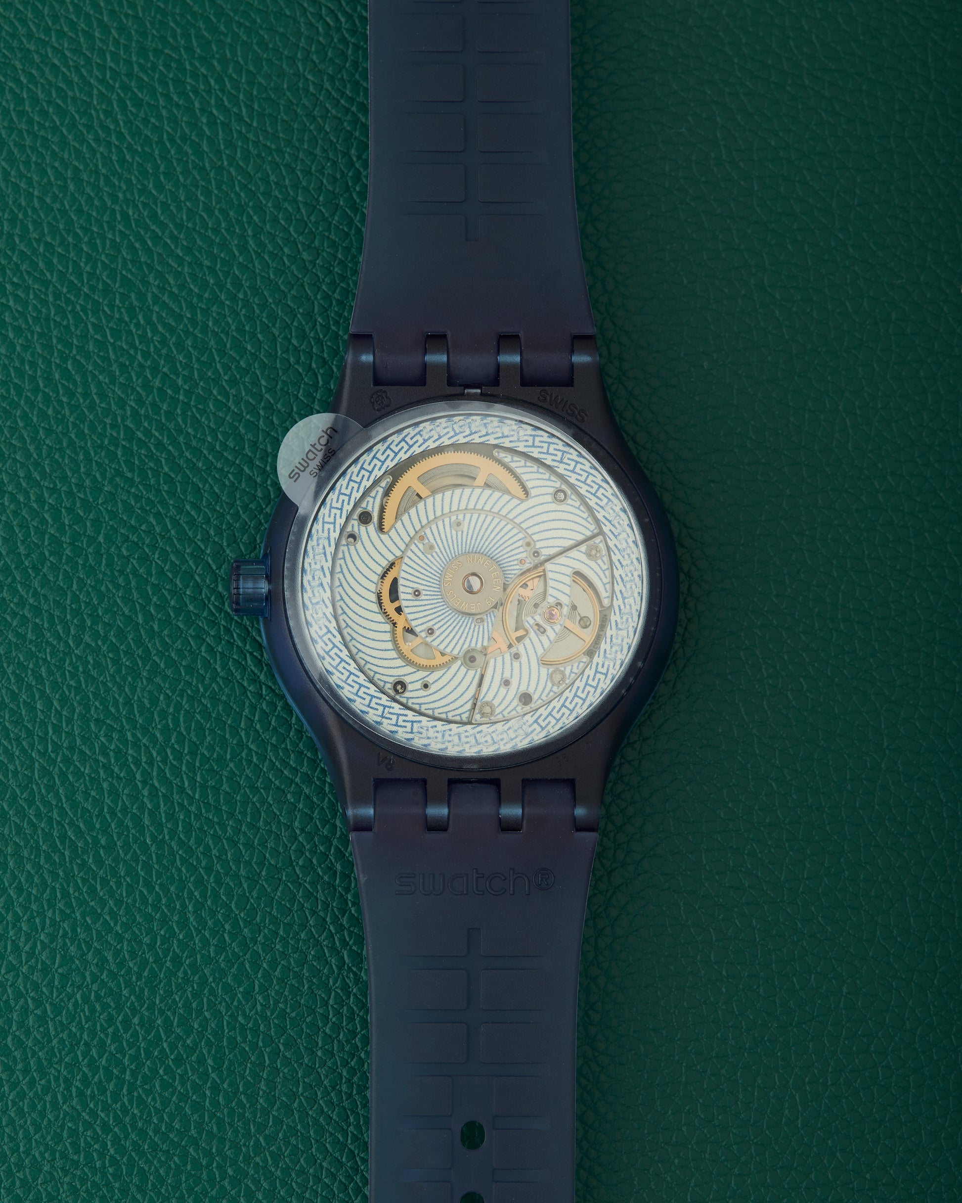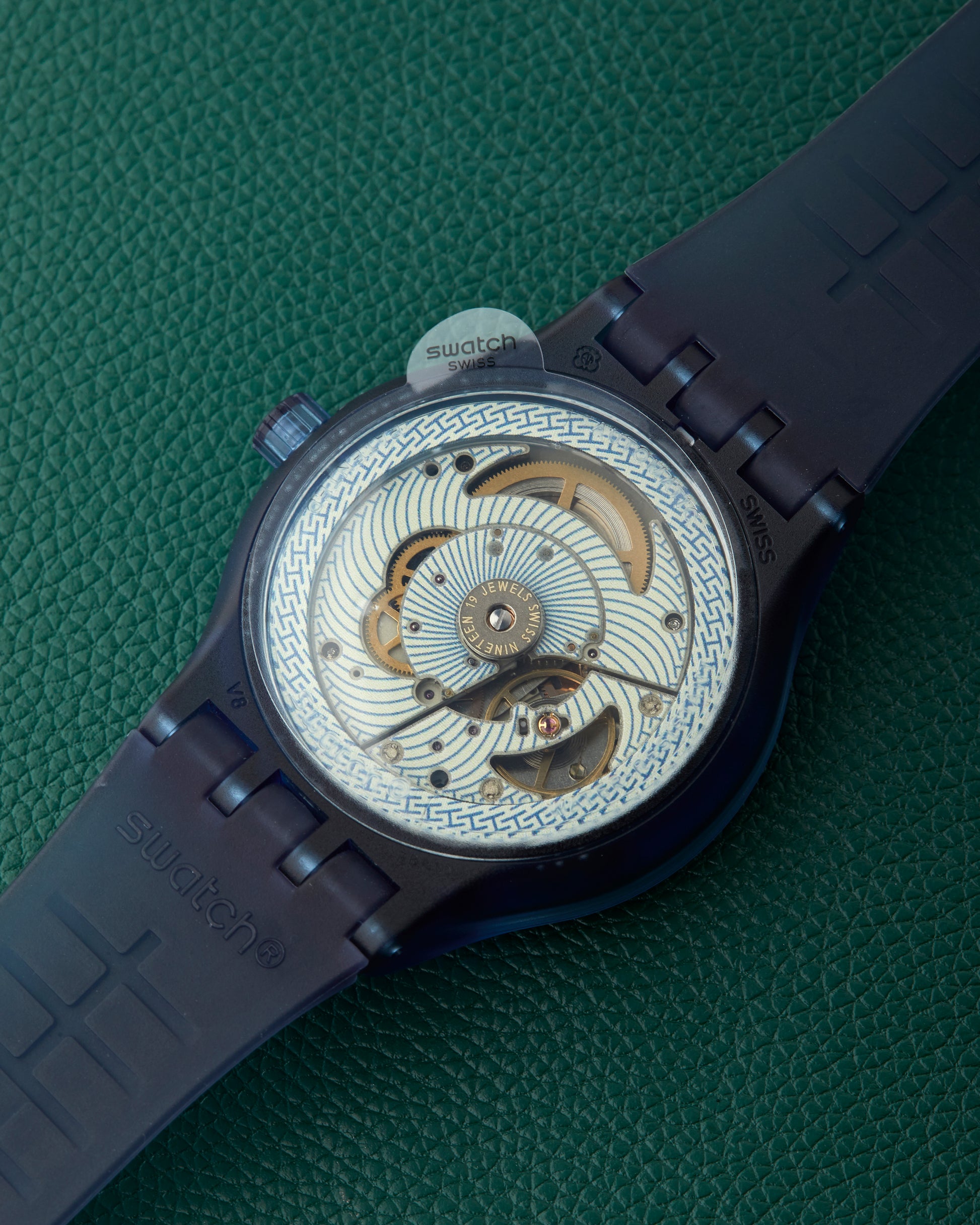 Through the exhibition caseback we get a clear view of the fully mechanical movement, the automatic Swatch calibre Sistem51.