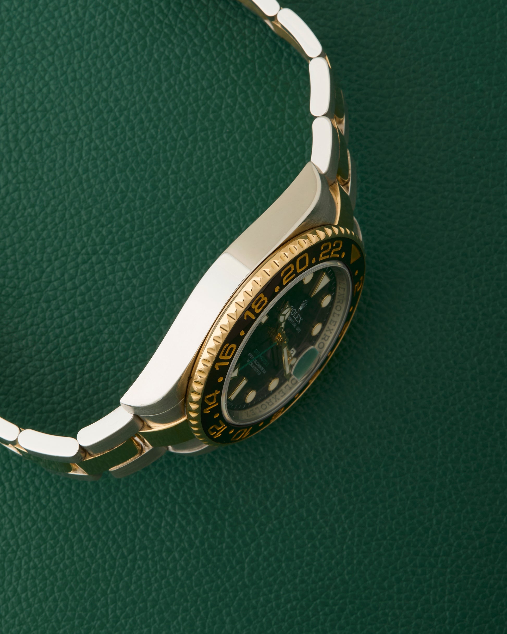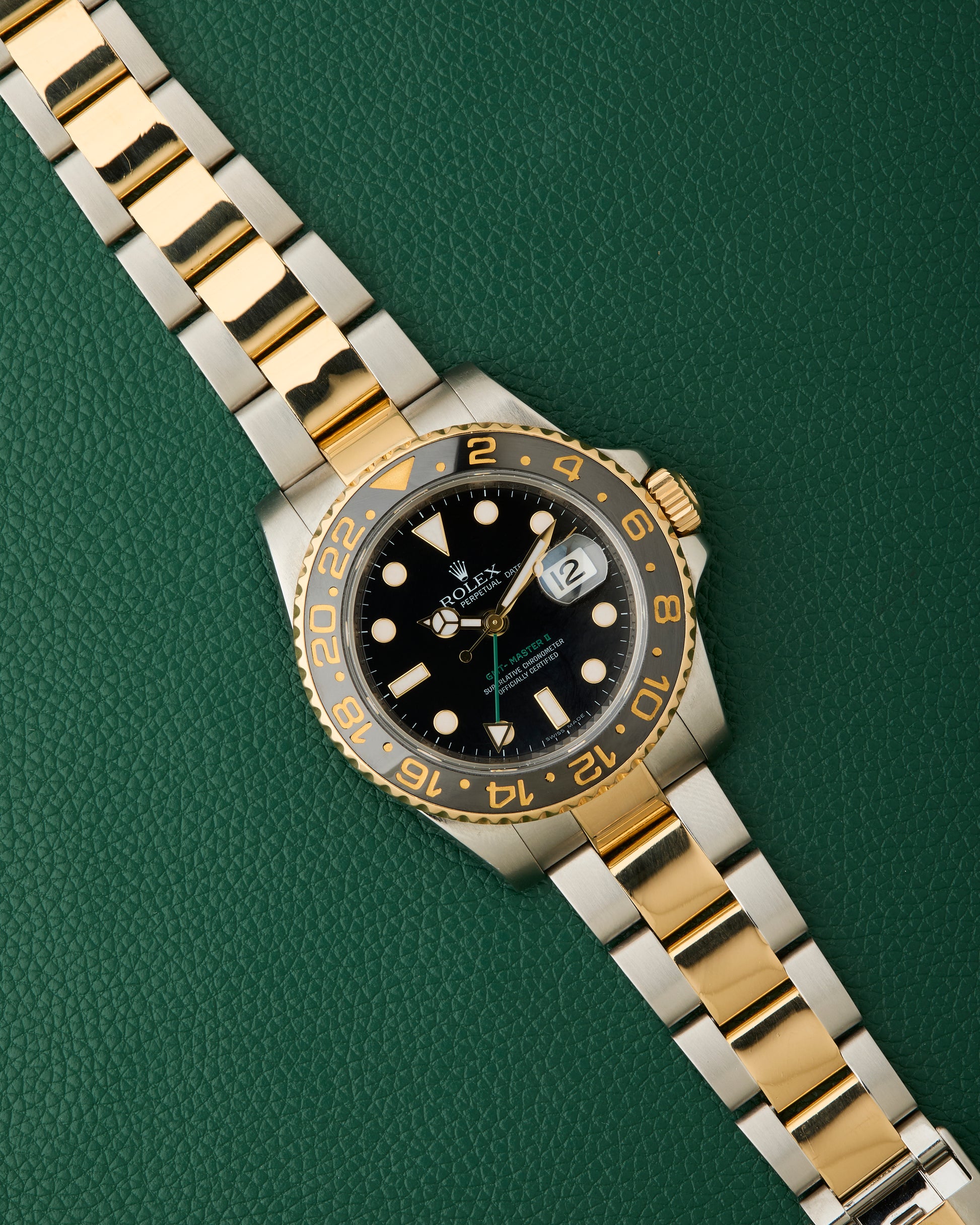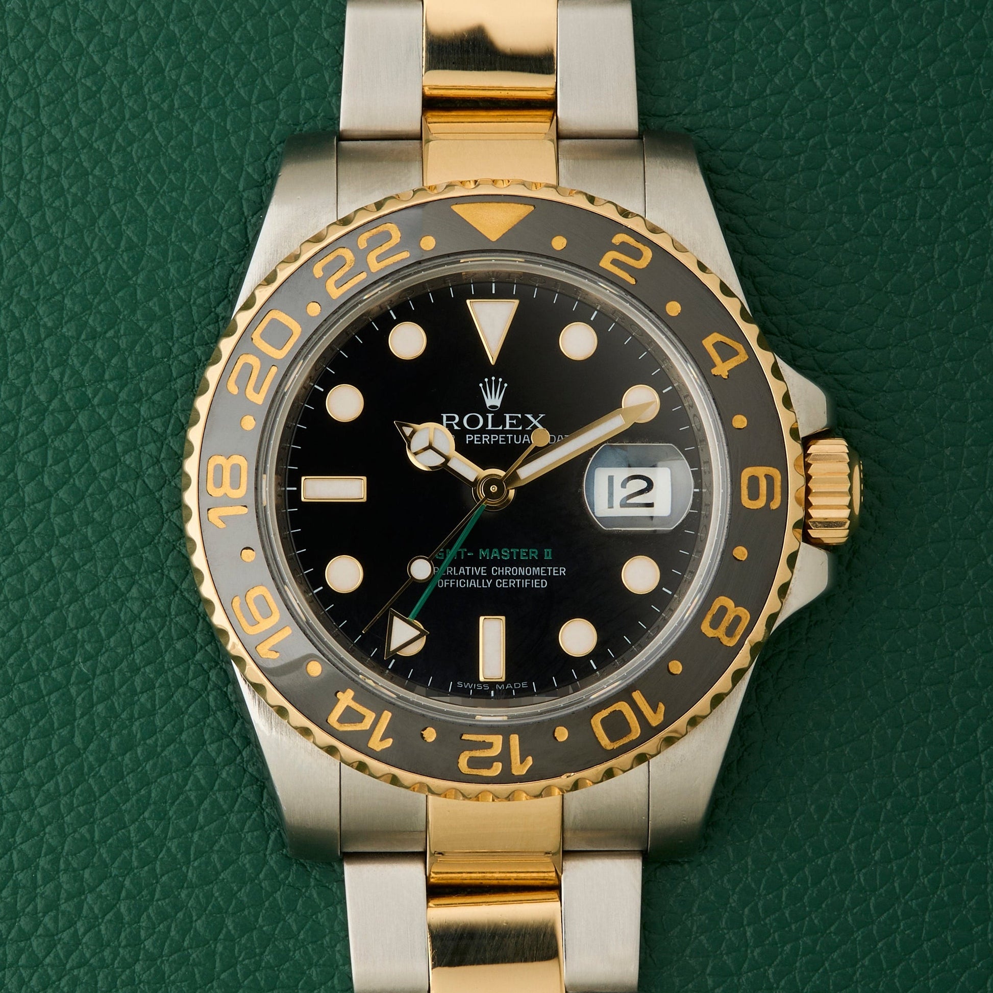 We have here a Rolex GMT-Master II with reference 116713 a combination of stainless steel and 18k yellow gold.