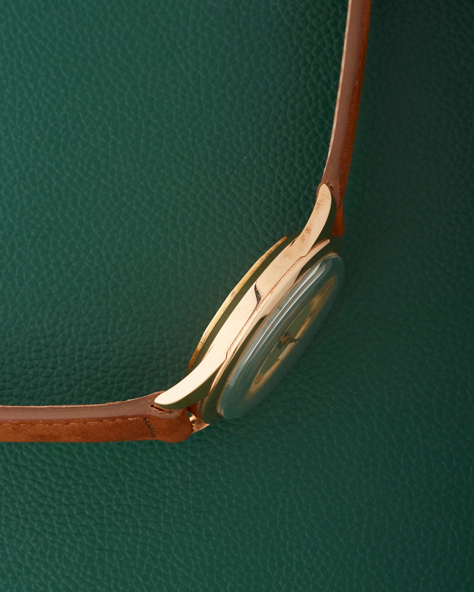 We have the sleek case with recessed crown adding to the vintage charm.