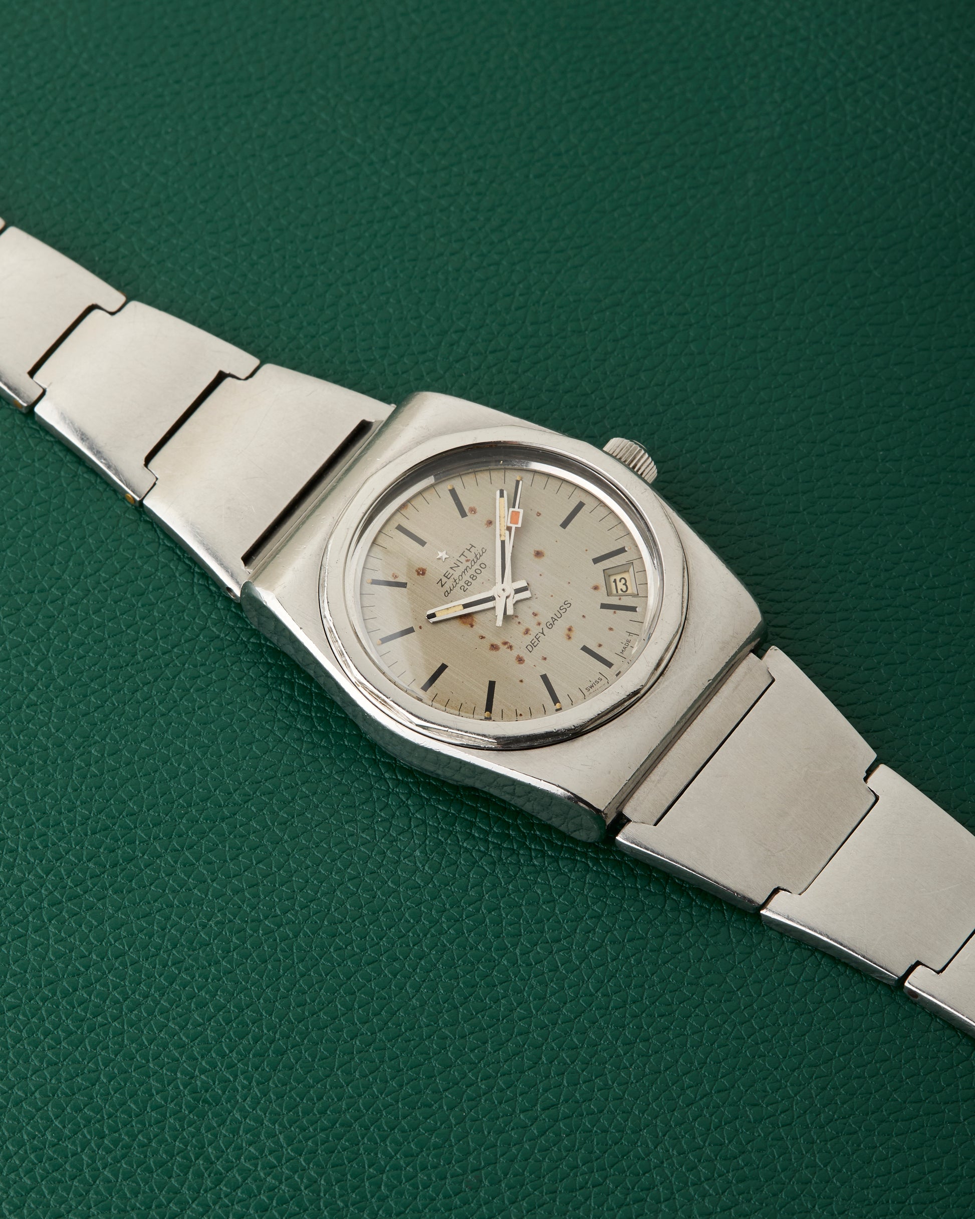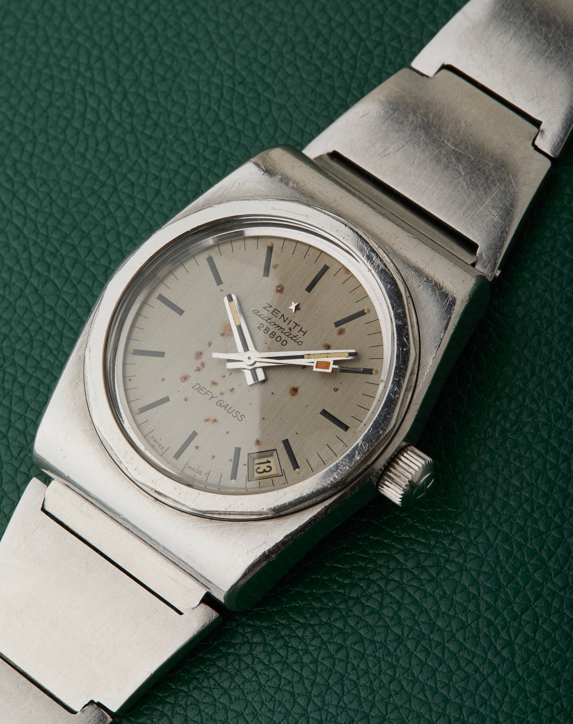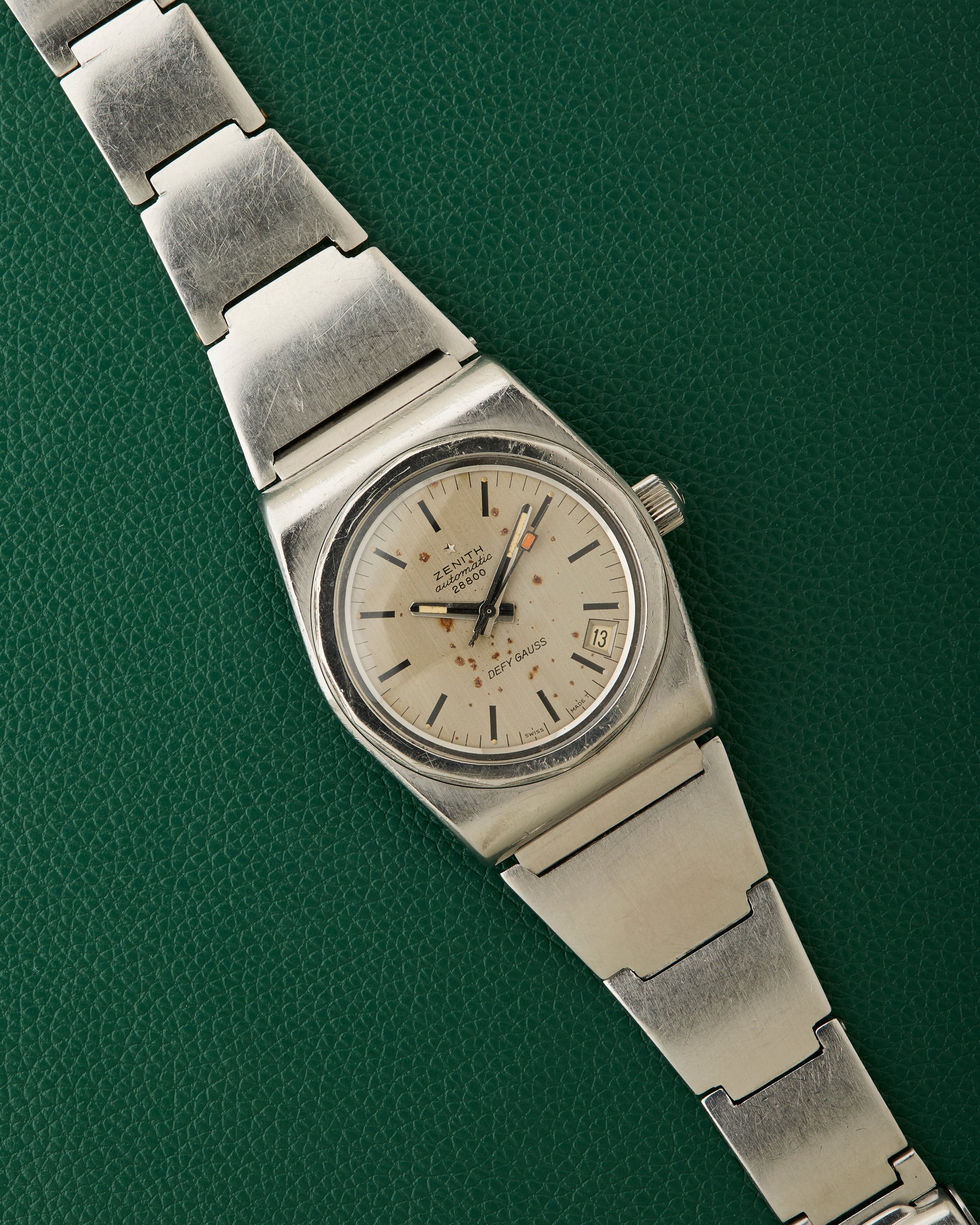 This Zenith Defy Gauss reference A7686 features a unique aged silver dial with the date window at 4:30.
