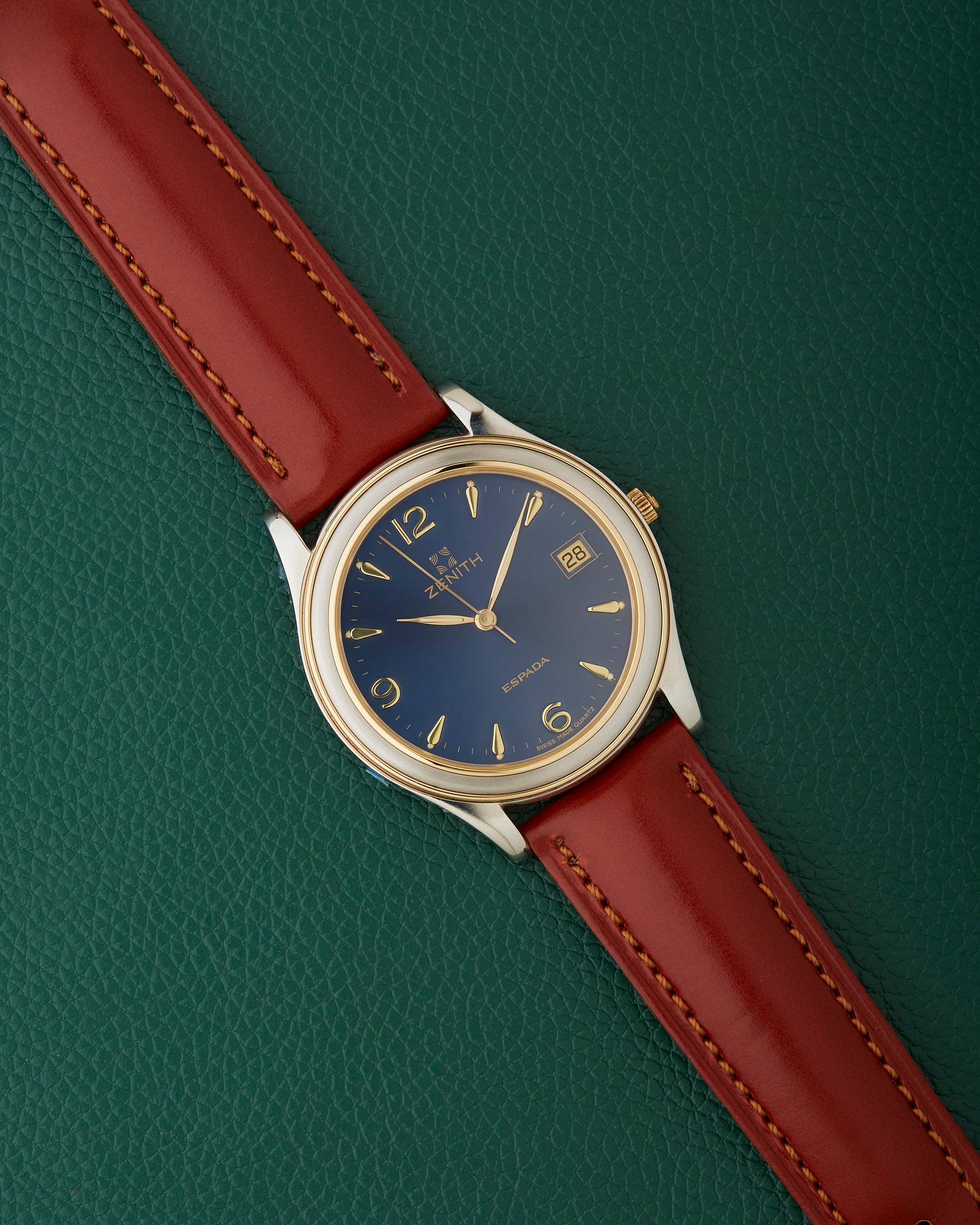 This Zenith Espada with the reference 198.001 features a stunning blue dial with date window at 3 o’clock.