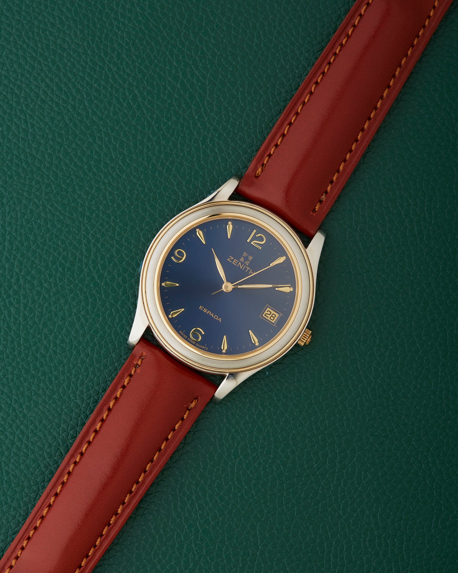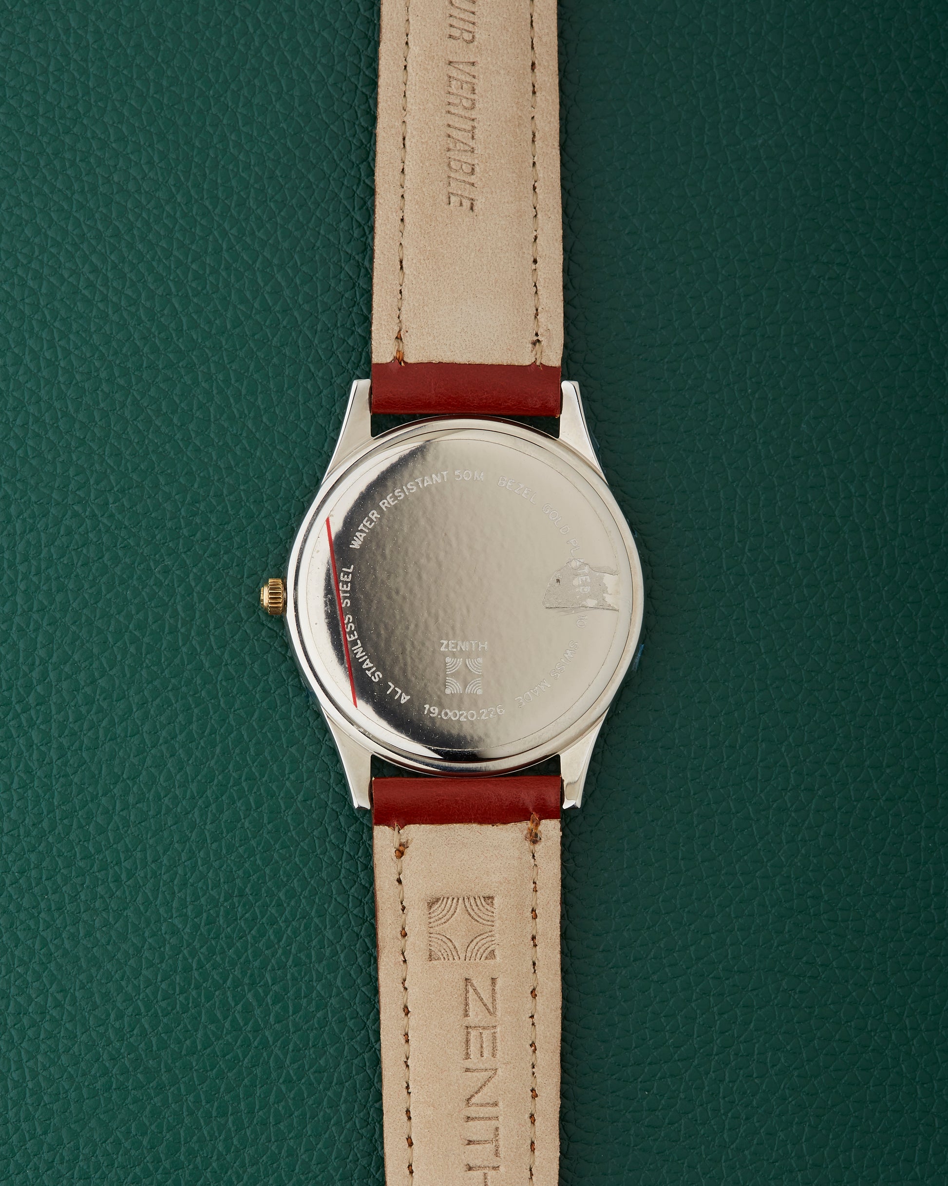 Comes paired with original Zenith strap, buckle, and hang tag.