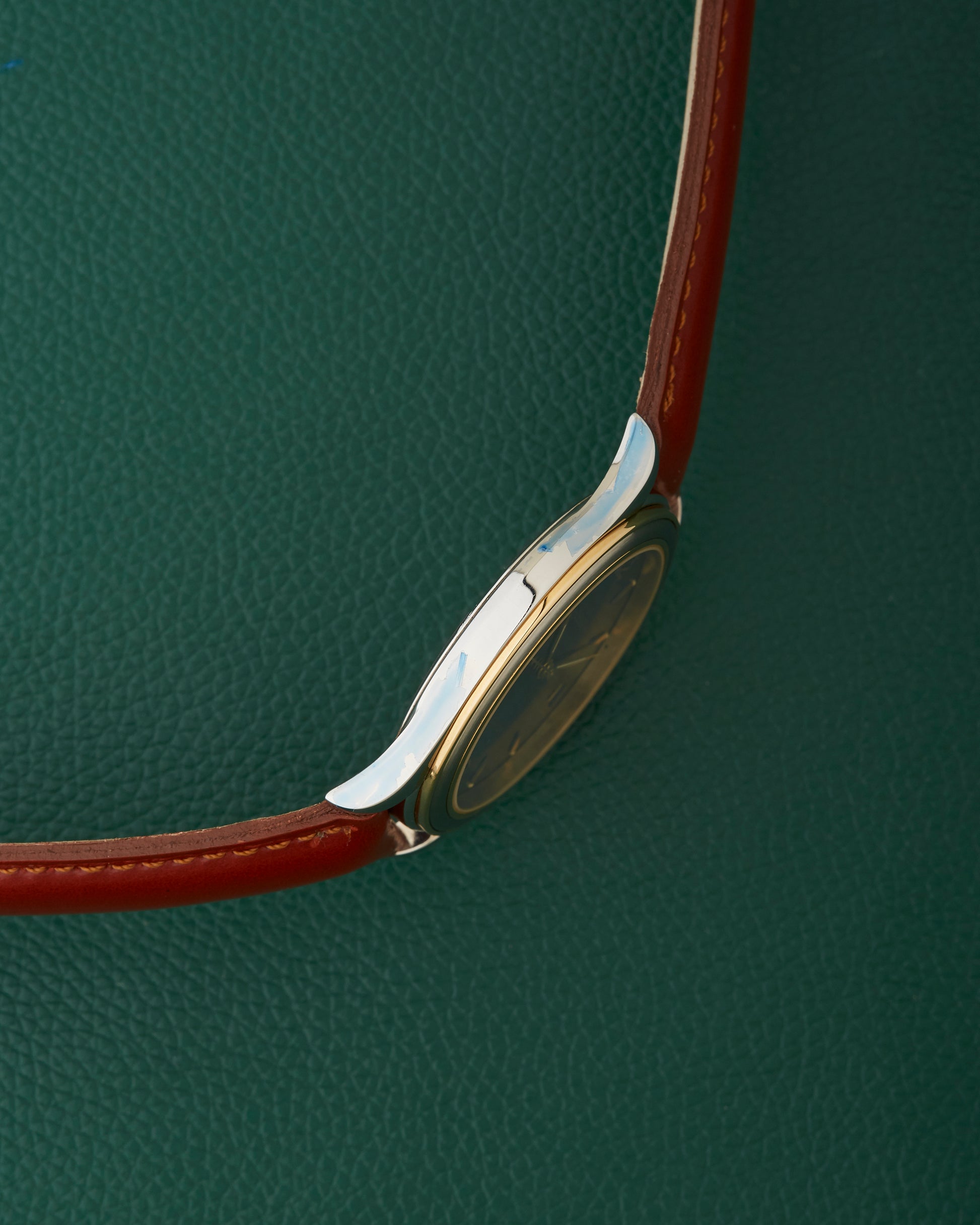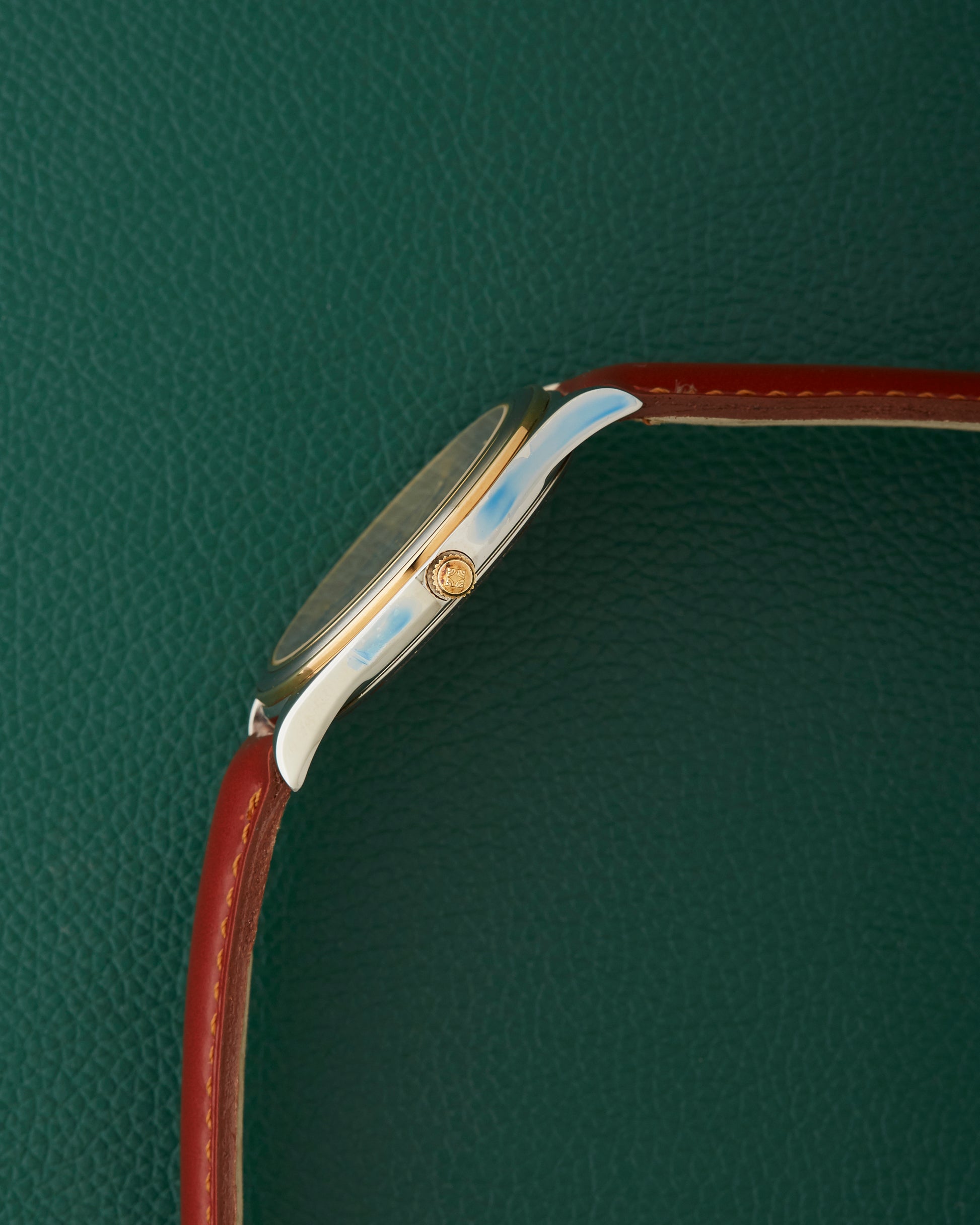 Its incredibly sharp 34mm stainless steel case with a Gold Platted bezel.