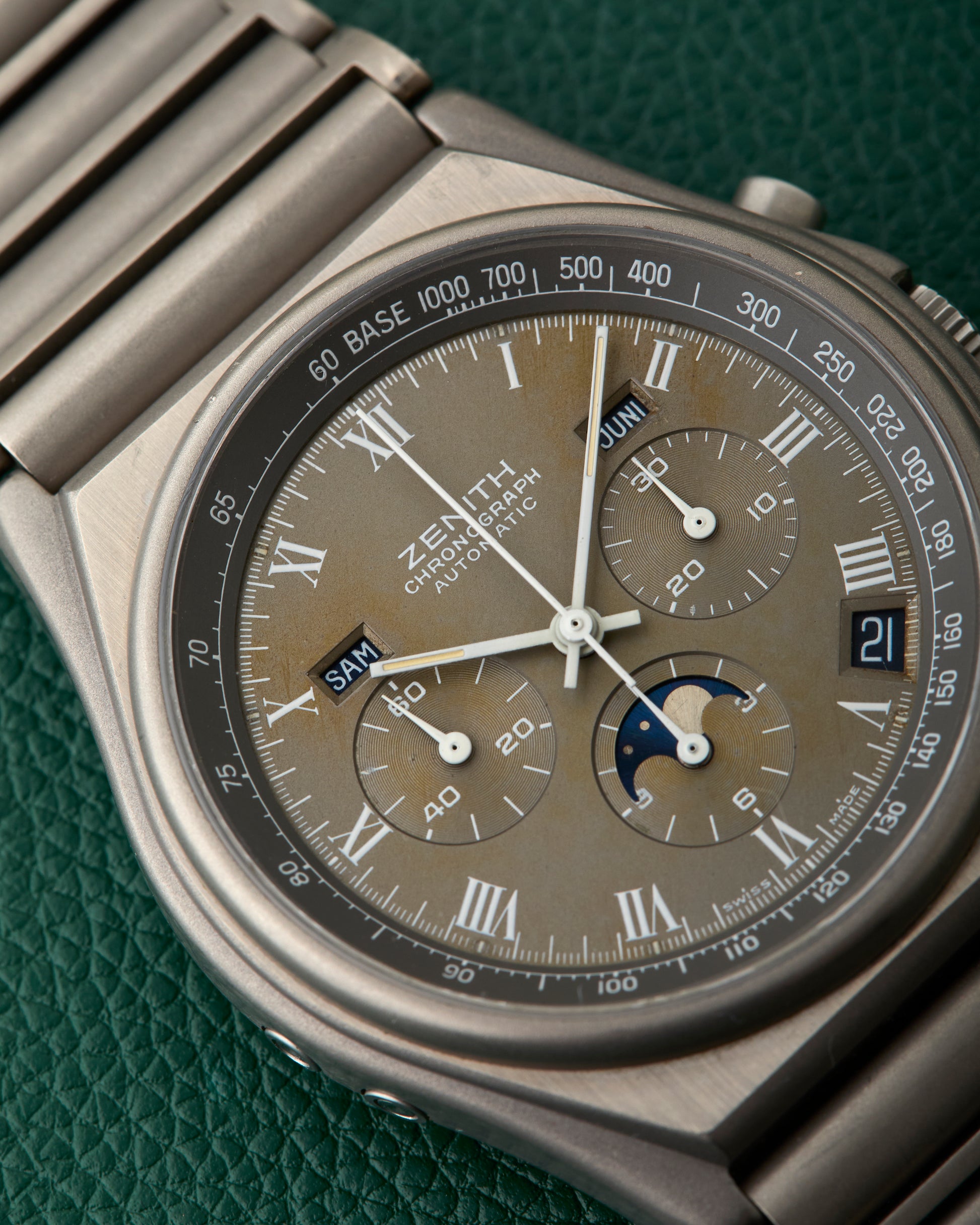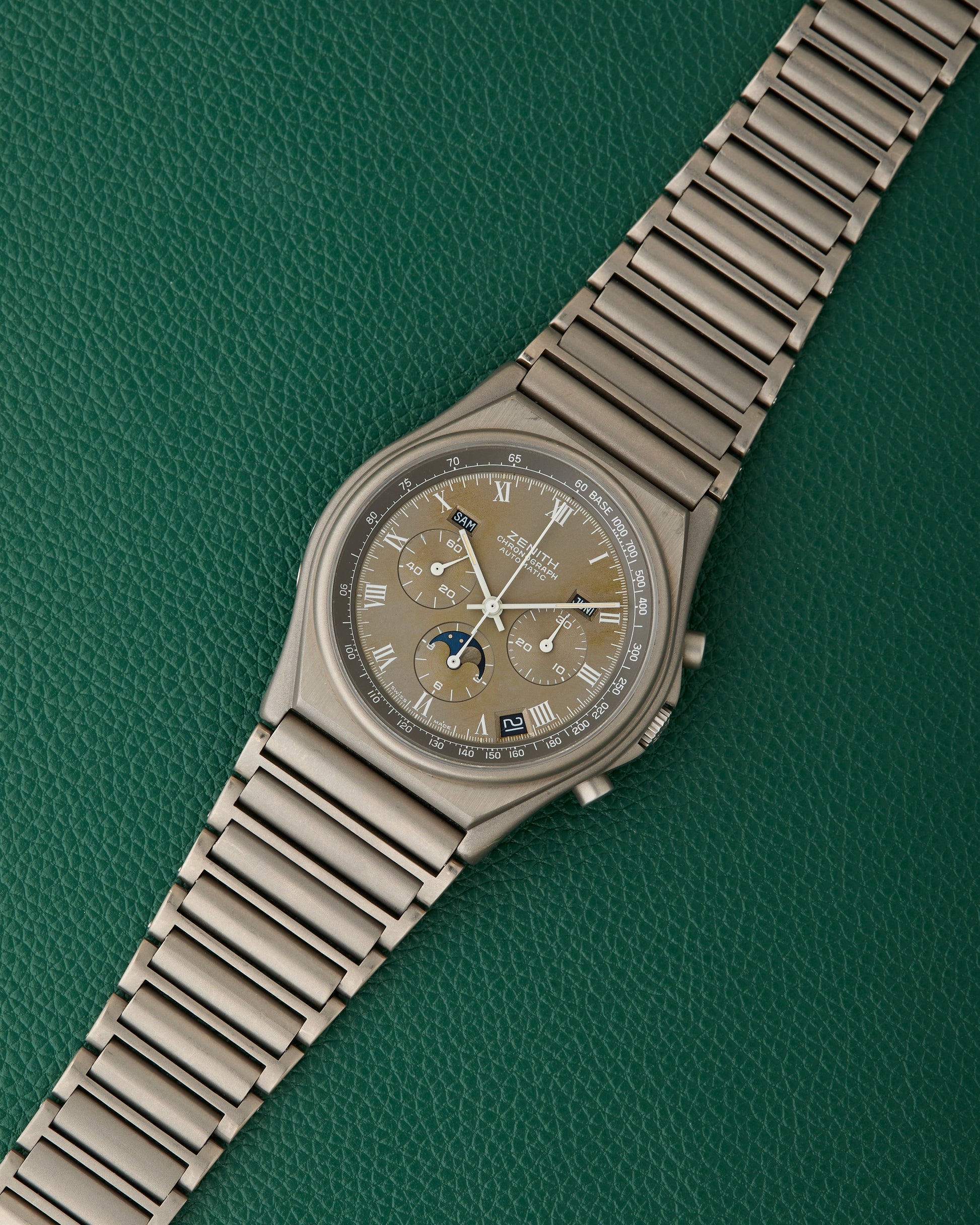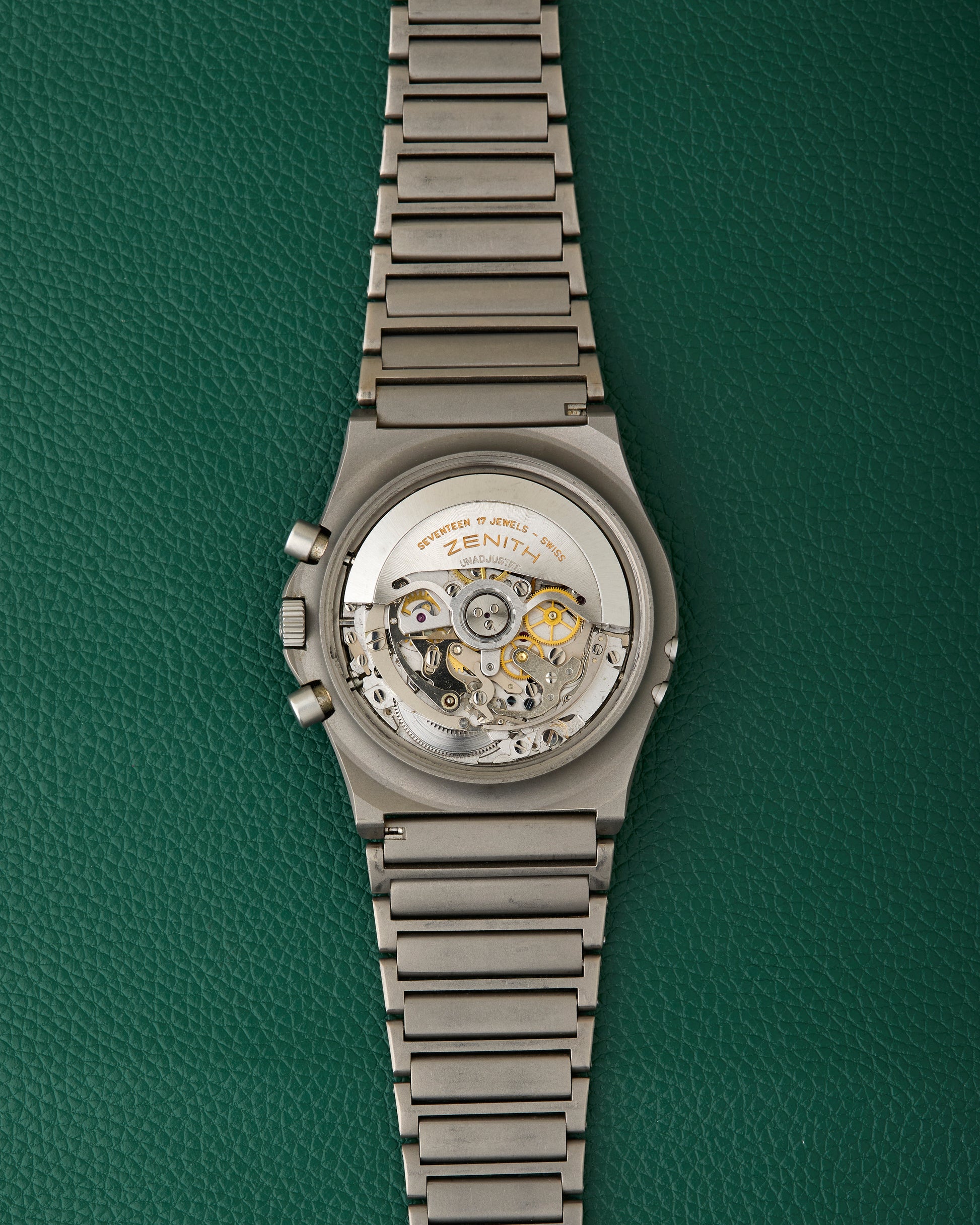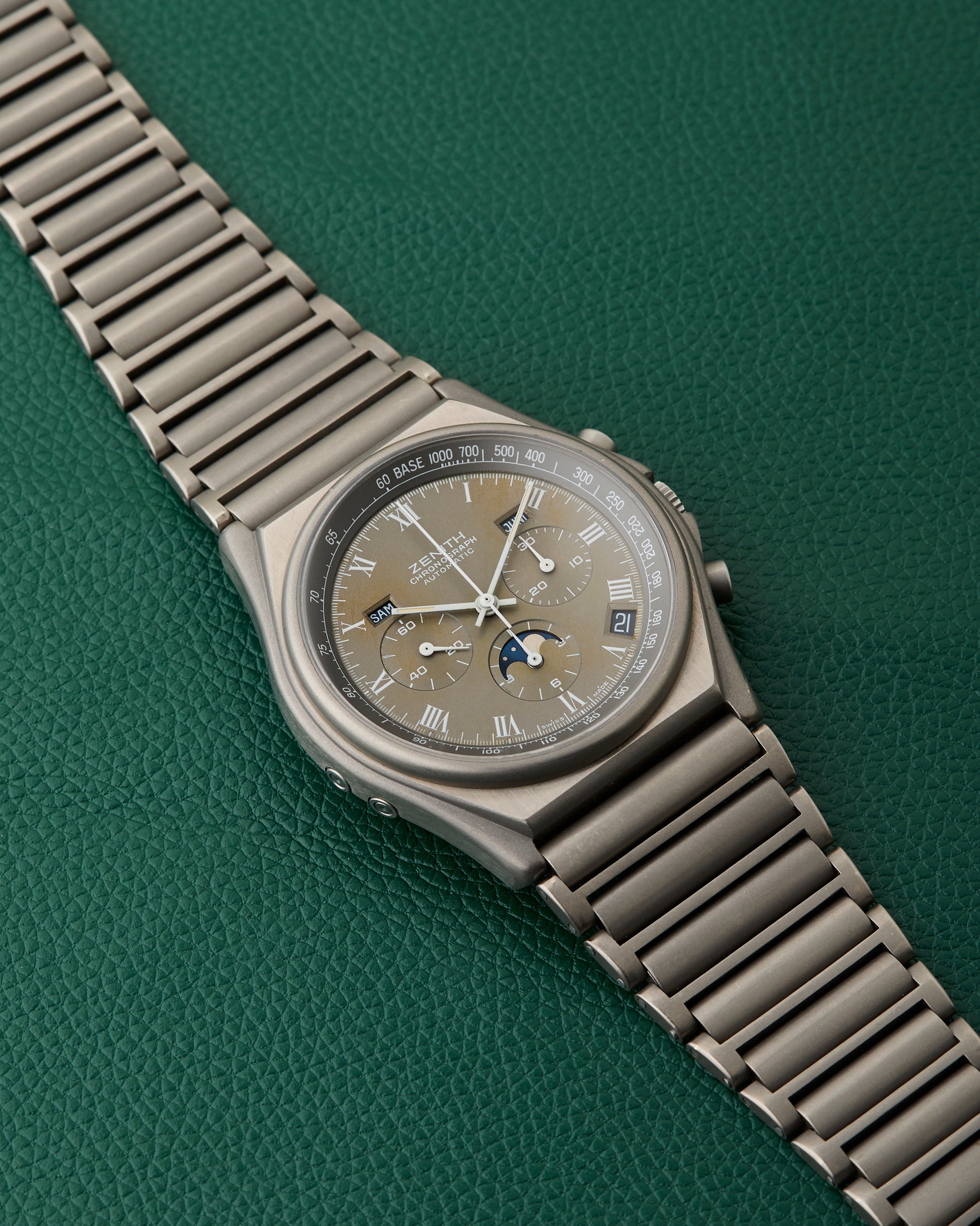 The 40mm case is made from titanium and fitted on its Zenith signed titanium bracelet.
