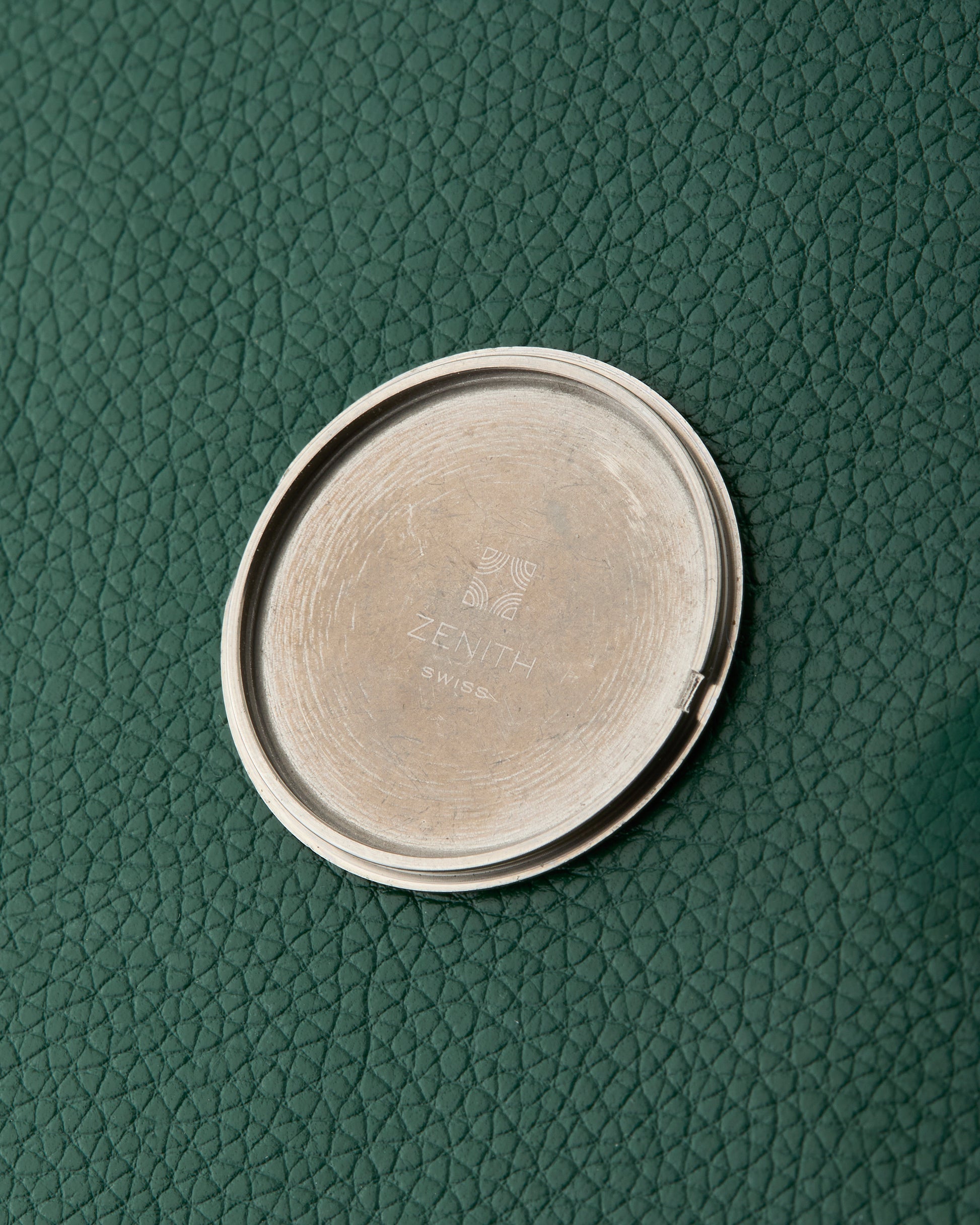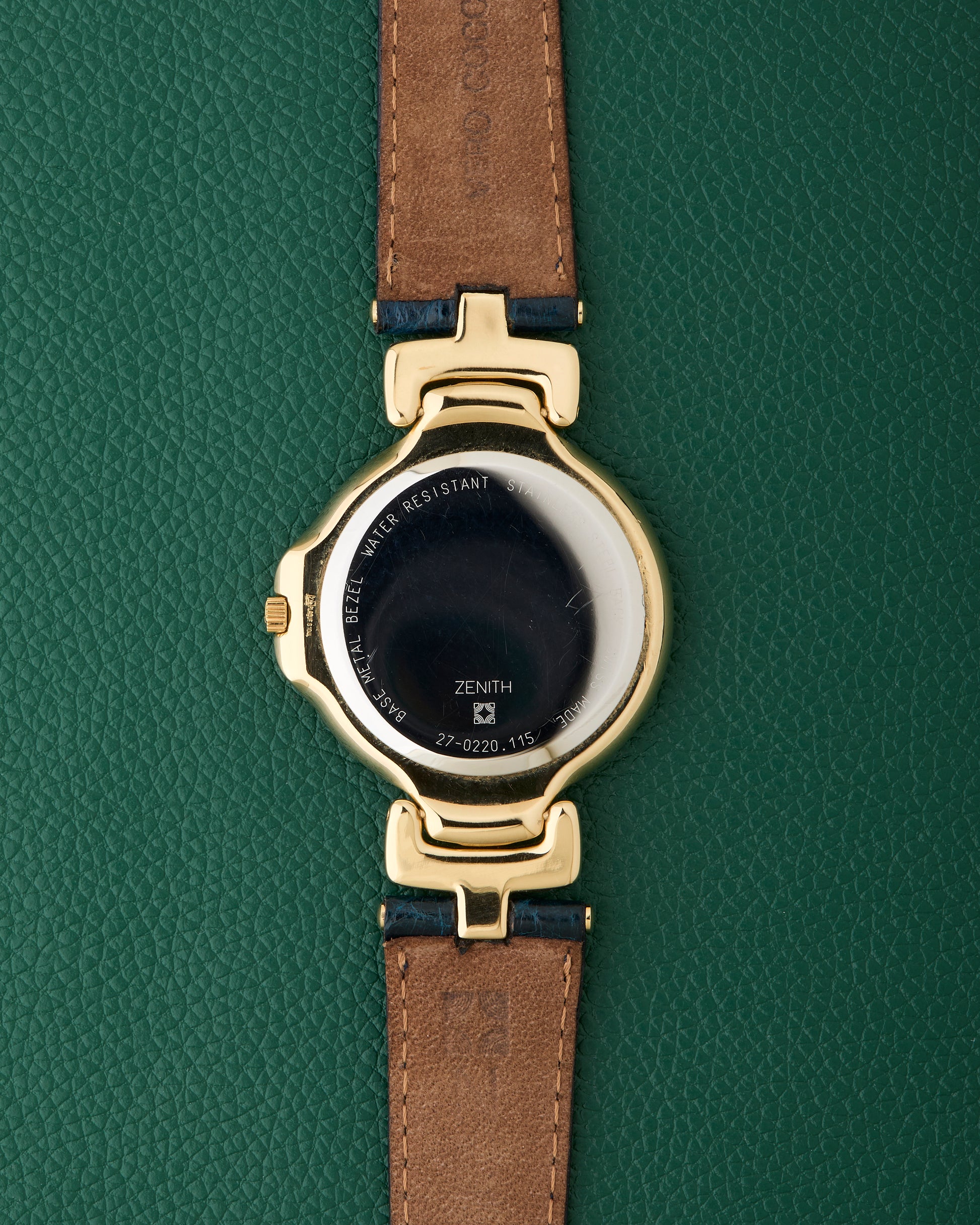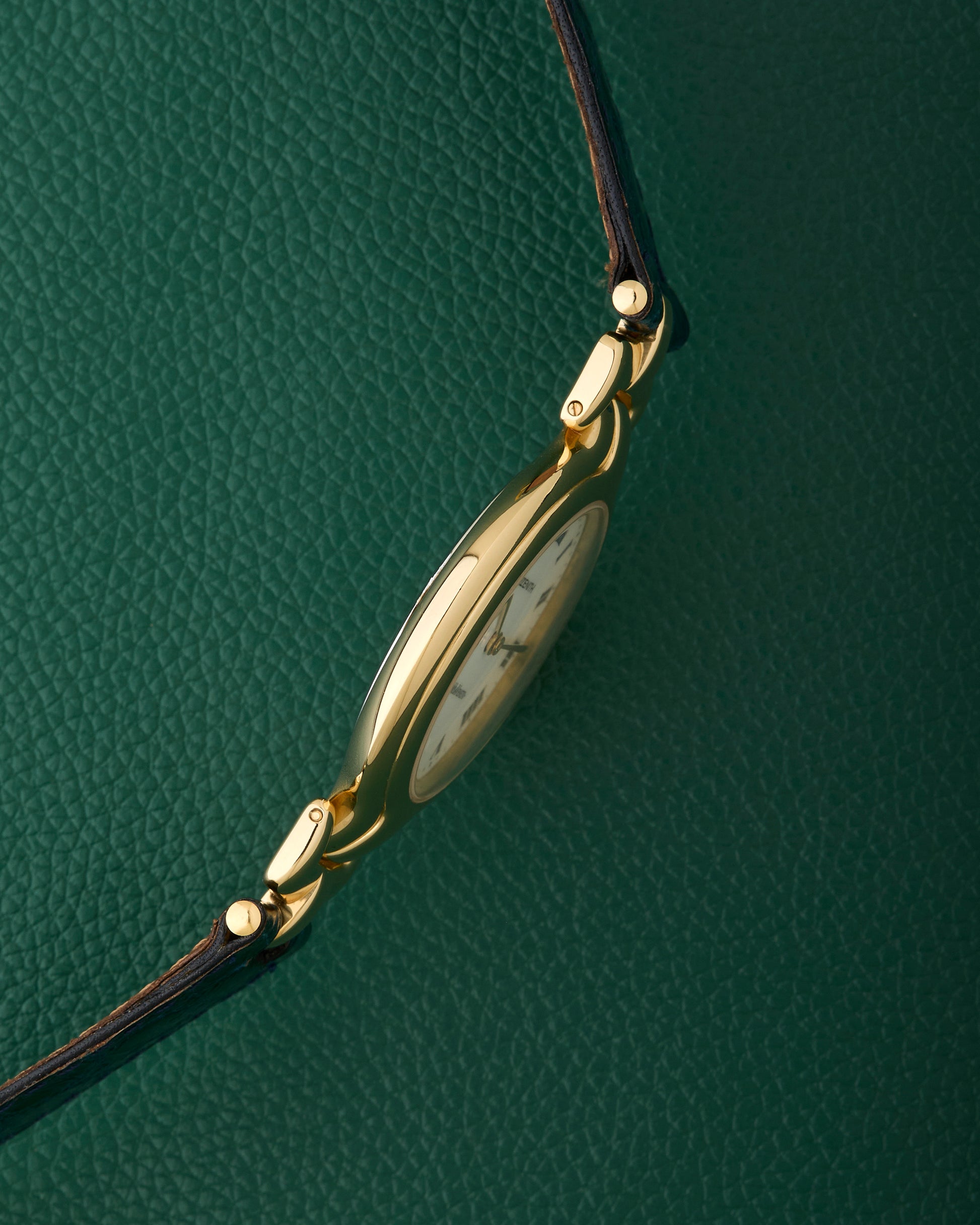 Paired with its original Zenith leather strap, along with a Zenith-signed buckle and crown.