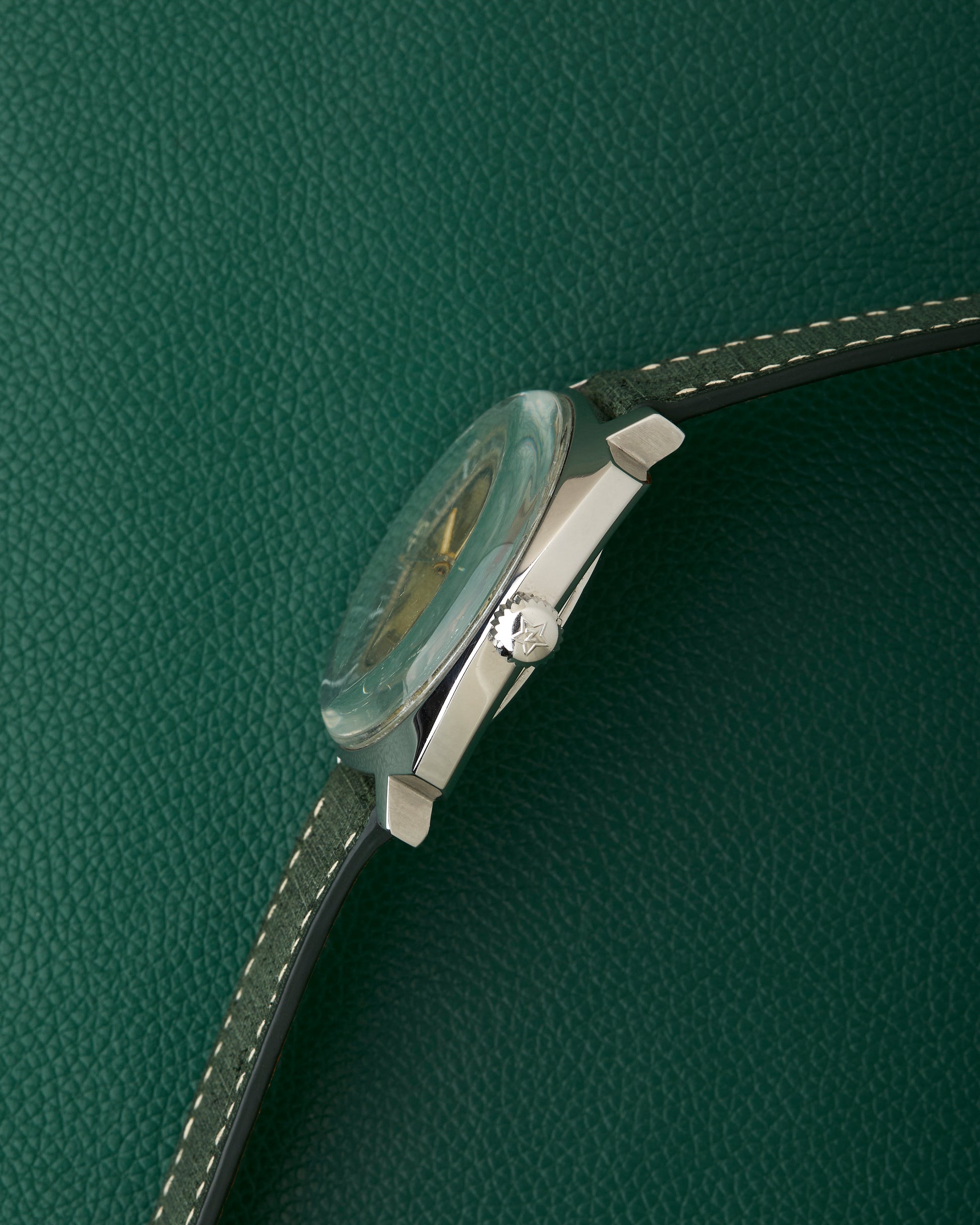 Comes on a DeLugs Moss Green Babele Slim Strap with DeLugs stainless steel Silver Classic Buckle.