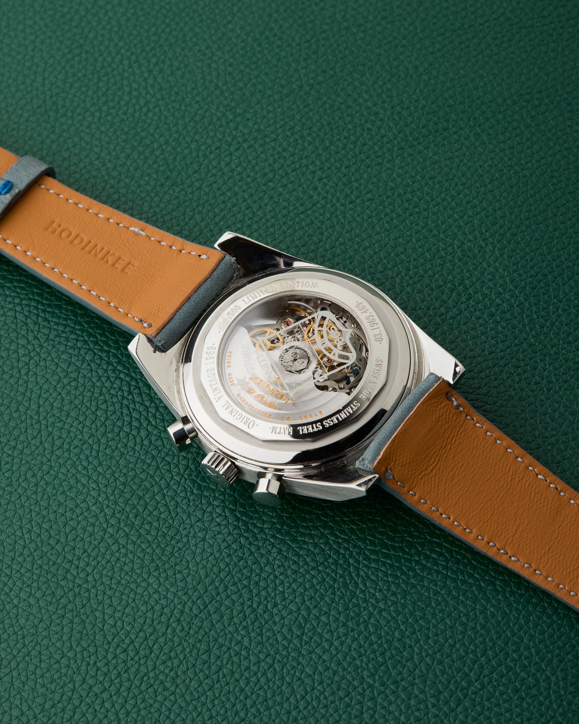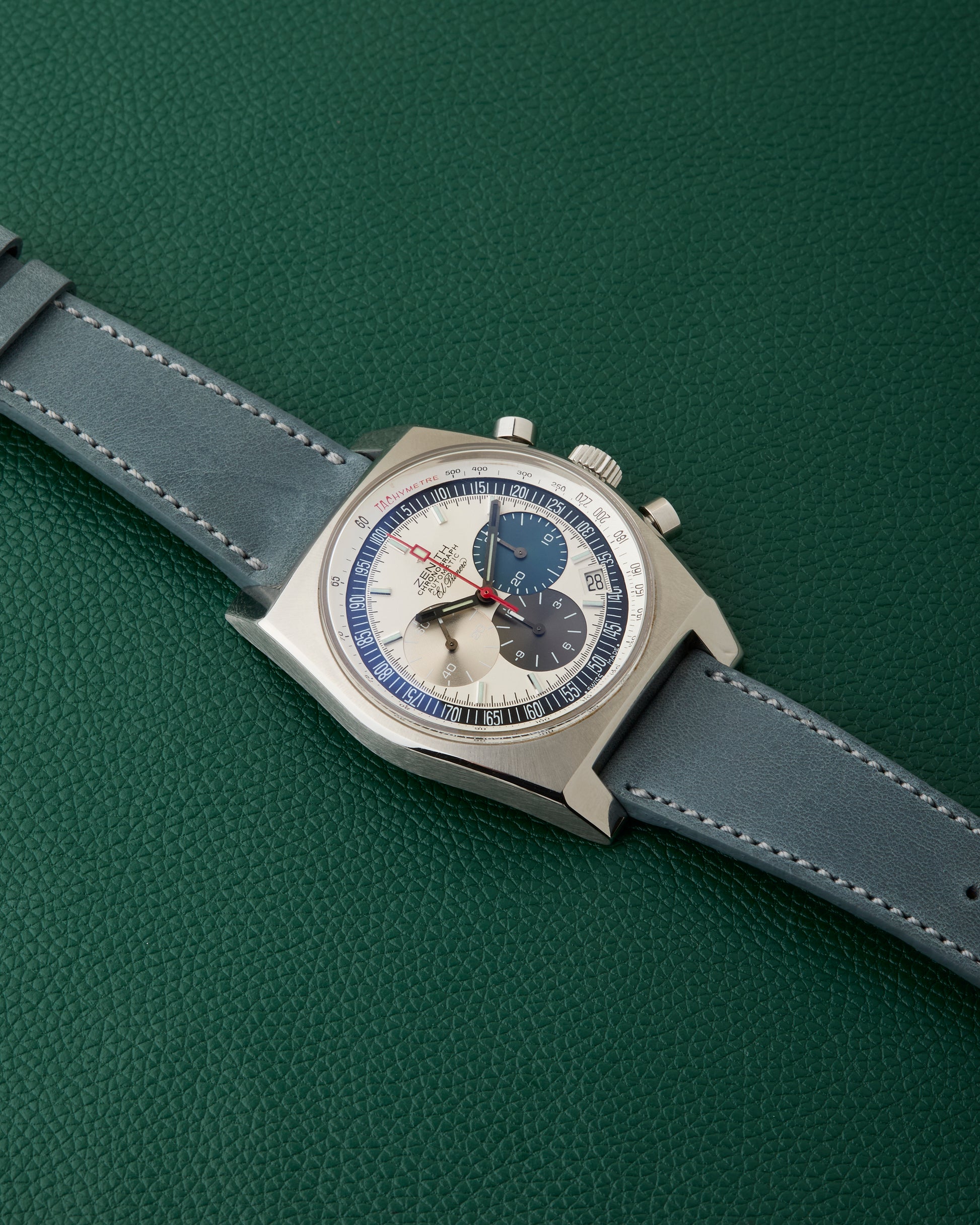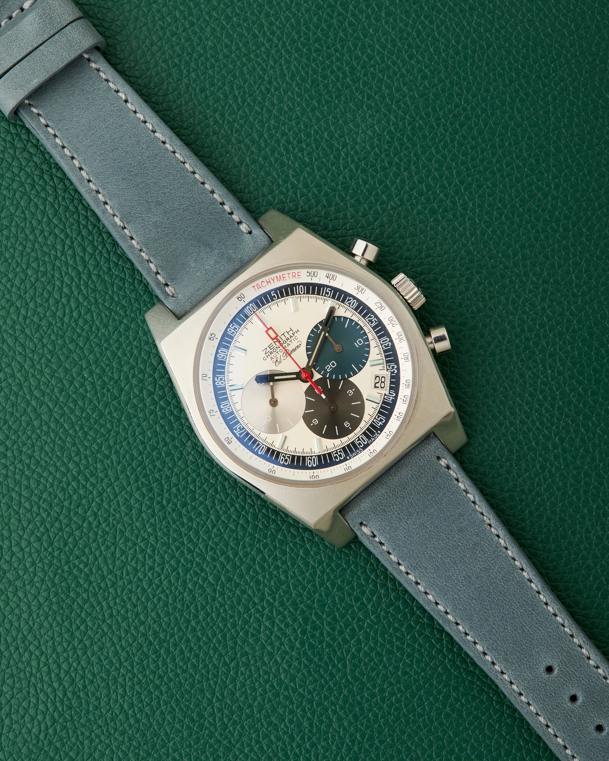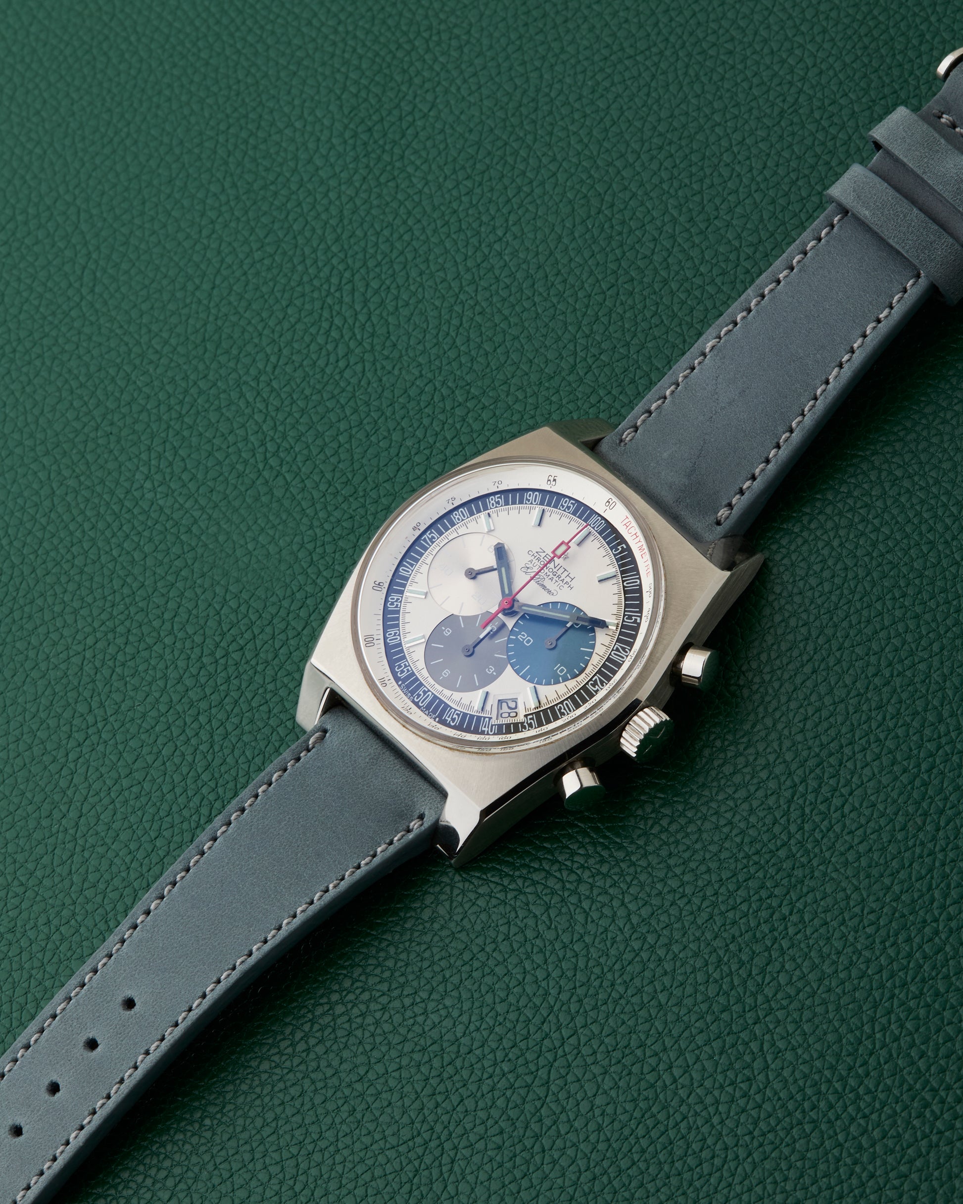 We have paired it with a powder blue strap from the legandary website Hodinkee, fitted with its stainless steel Zenith buckle.